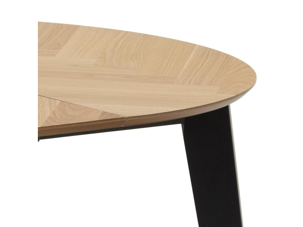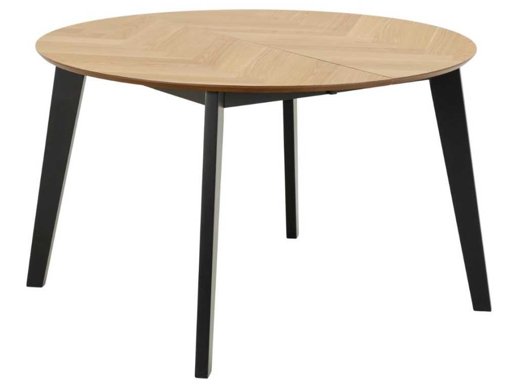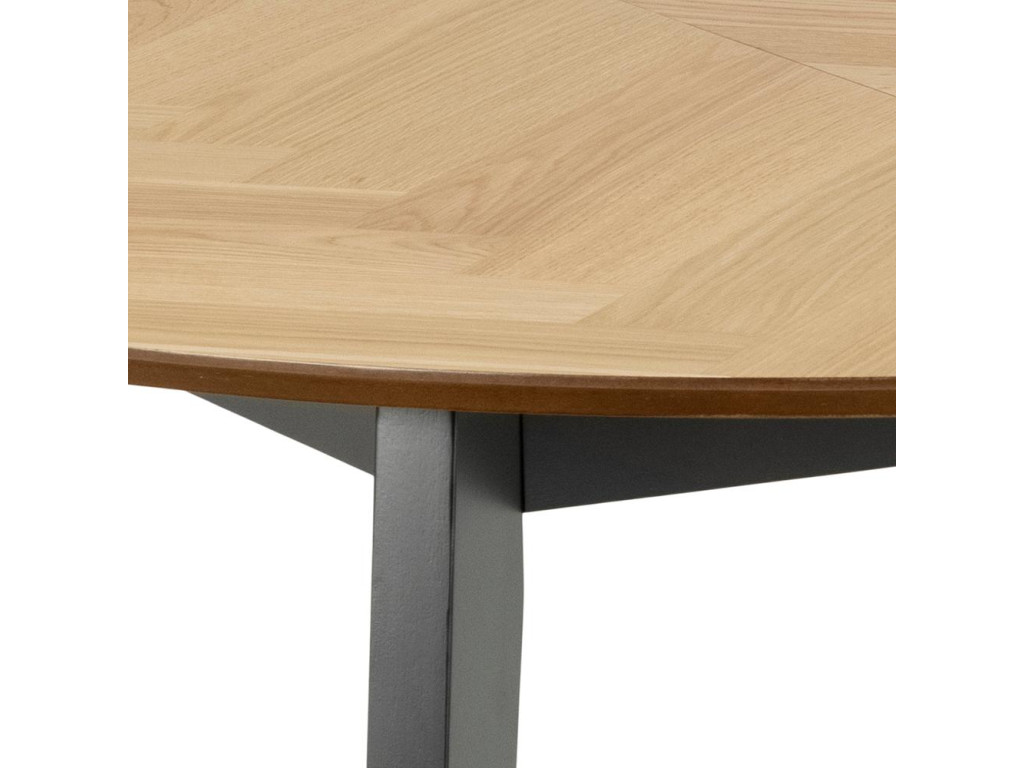Stôl Georgetown v okrúhlom tvare s možnosťou rozloženia až na 198 cm zaujme dubovou dyhou s rybou kosťou. Čierna kaučuková základňa dotvára industriálny nádych. Perfektný pre rodinné oslavy i bežné večere.
