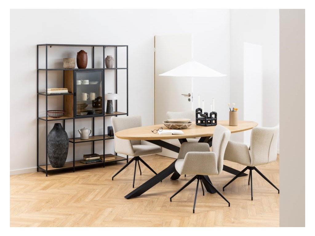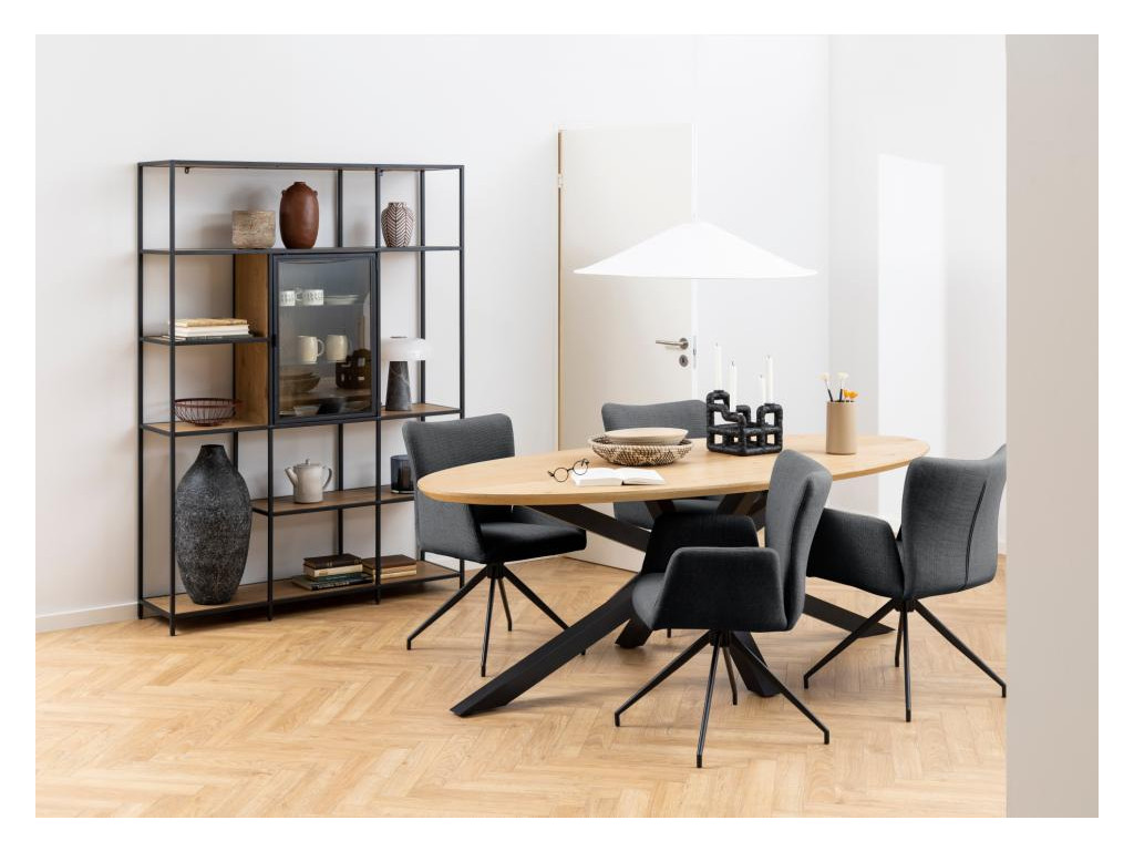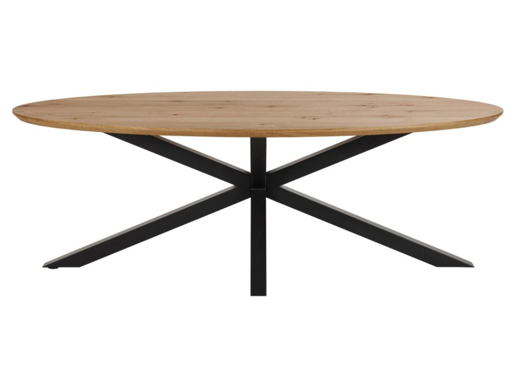 Oválny stôl Heaven v kombinácii divokého duba a čiernej ocele je pôsobivým stredobodom každej jedálne. Elegantný tvar a odolná konštrukcia vytvárajú harmonický kontrast medzi prírodnými a industriálnymi prvkami.