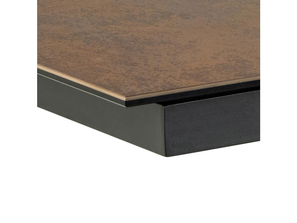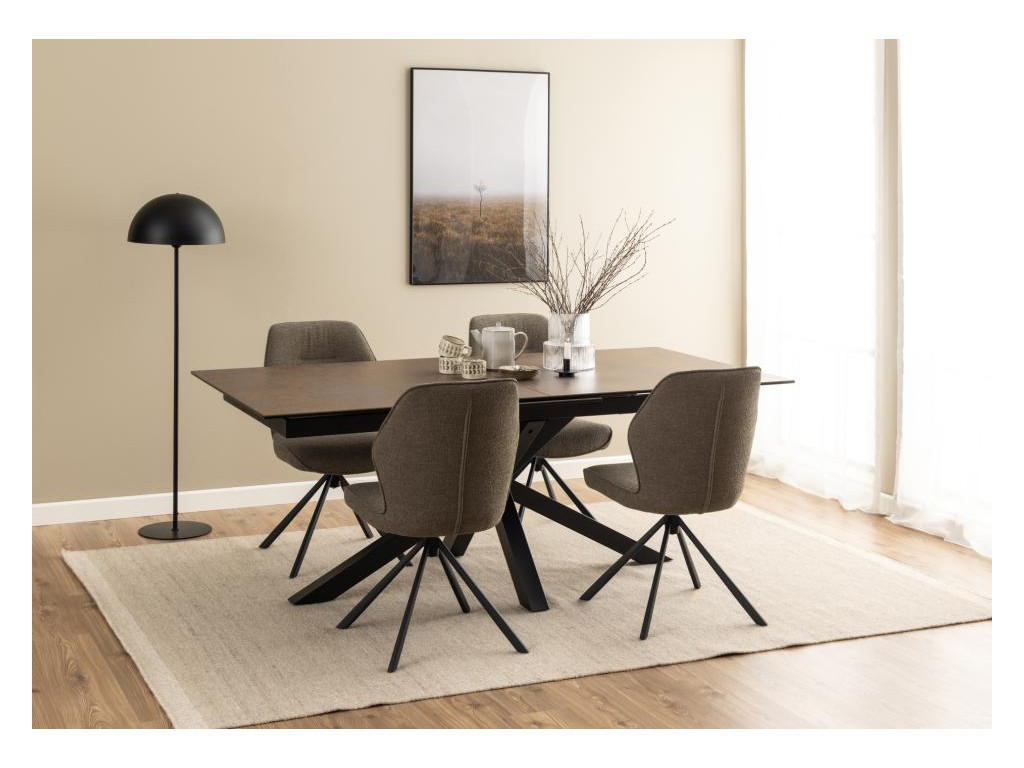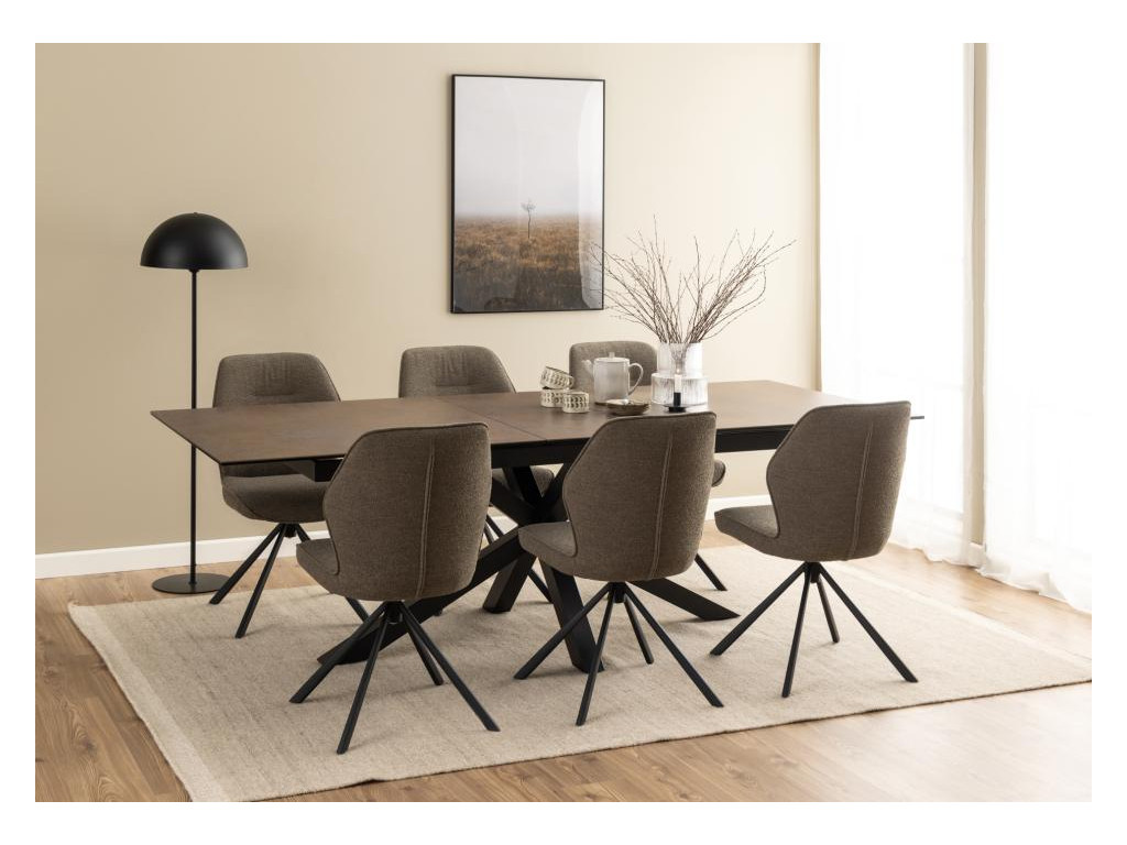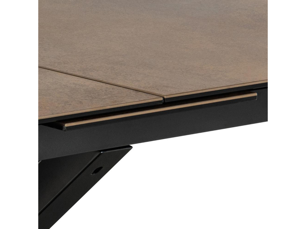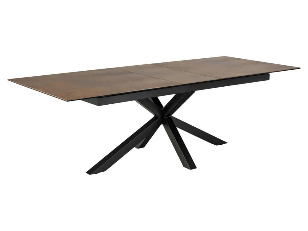 Elegantný stôl Heaven v rozmernejšej verzii ponúka dostatok priestoru na veľké stretnutia. Hrdzavohnedá keramická doska pôsobí robustne a prirodzene zároveň. Podnož v matnej čiernej oceľovej úprave dotvára industriálny charakter stola. Rozkladací mechanizmus zaisťuje variabilitu bez kompromisov.