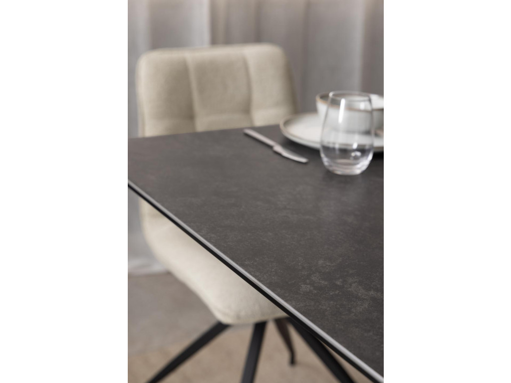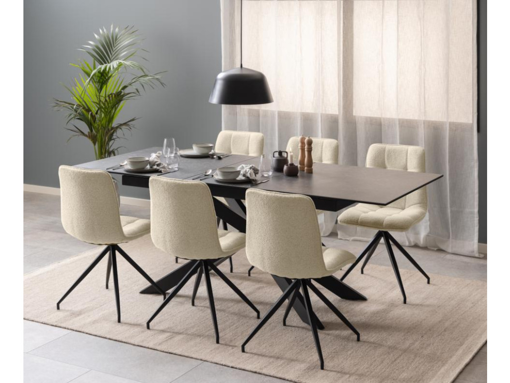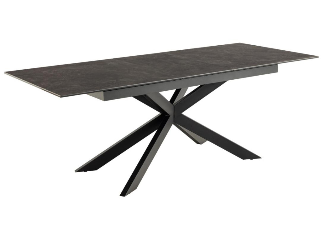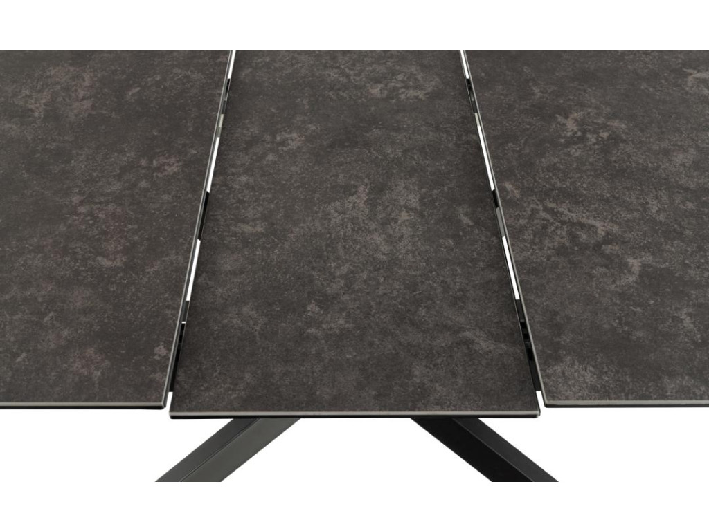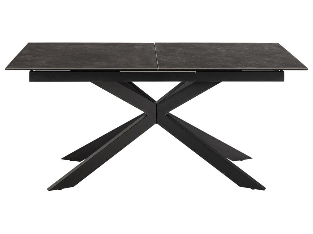 Moderný rozkladací stôl Irwine ponúka spojenie odolnosti a dizajnu. Stolová doska z čiernej, drsnej keramiky Fairbanks je odolná voči teplu aj poškriabaniu a vďaka integrovanému synchrónnemu výsuvu možno stôl jednoducho rozšíriť zo 168 na 210 cm. Predlžovacia doska sa automaticky ukladá pod dosku stola. Krížová podnož z matnej čiernej ocele s práškovou povrchovou úpravou dopĺňa moderný vzhľad a zaisťuje stabilitu.