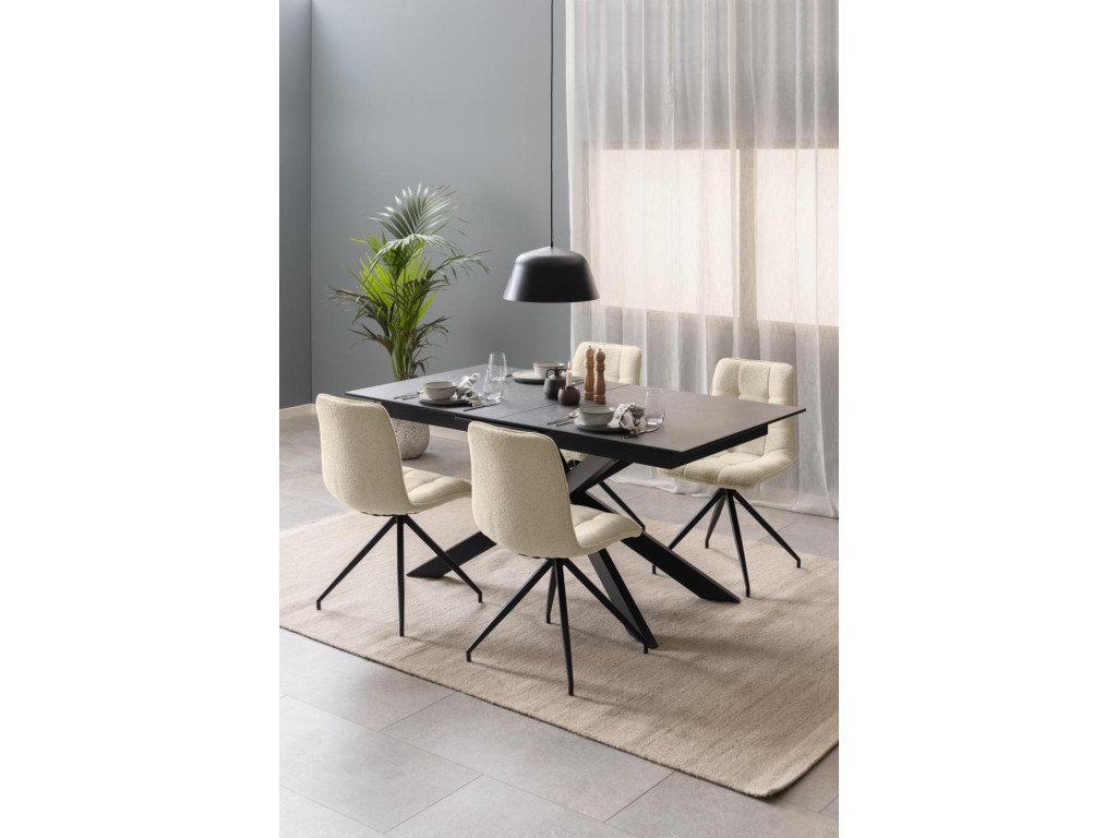 Stôl Irwine v elegantnom čiernom keramickom dekore je praktickým riešením pre moderné domácnosti. Jeho čisté línie a funkčné predĺženie z neho robia ideálnu voľbu do kuchýň aj jedální. Krížová oceľová základňa je stabilná a opticky ľahká. Ideálny pre štýlové stolovanie.