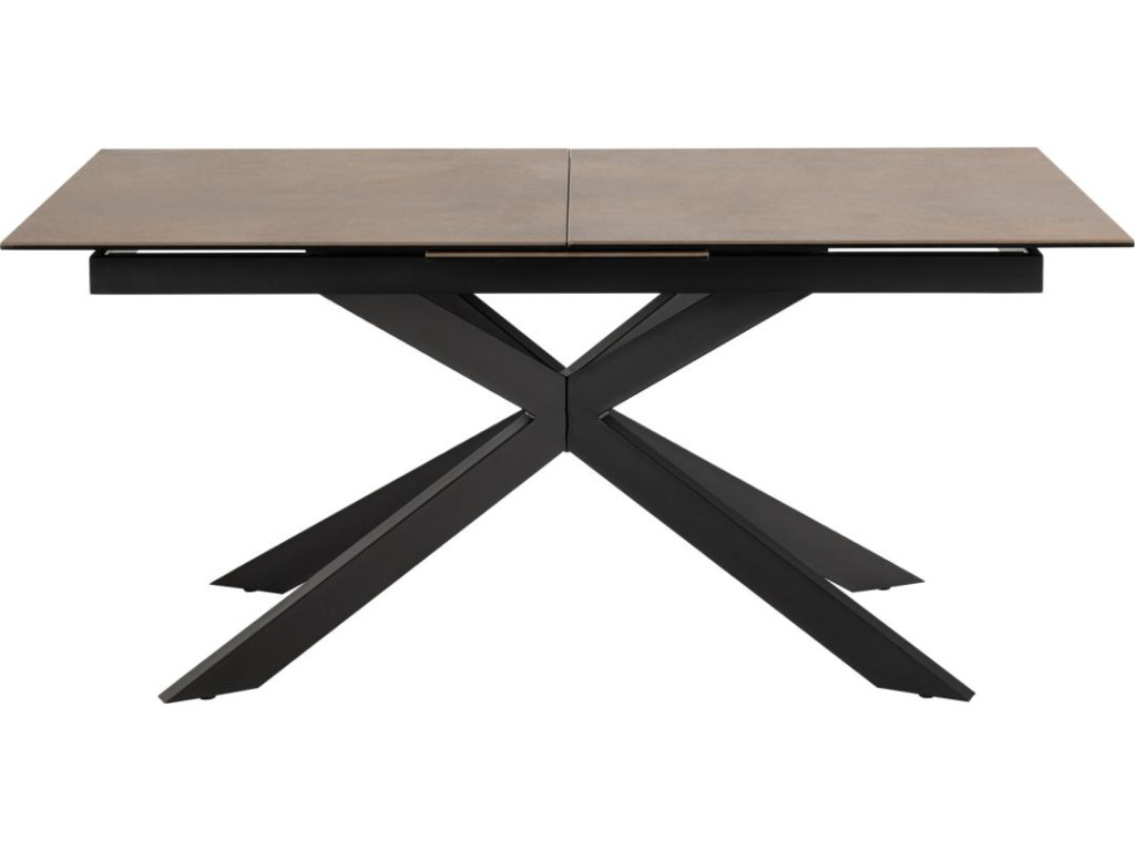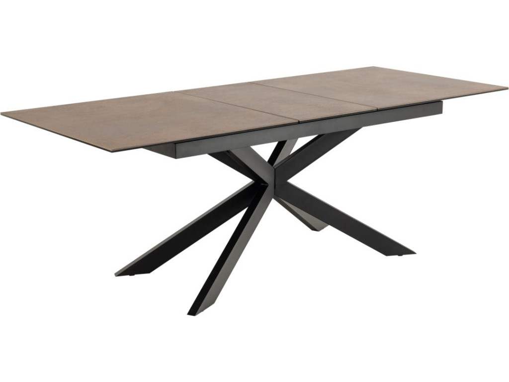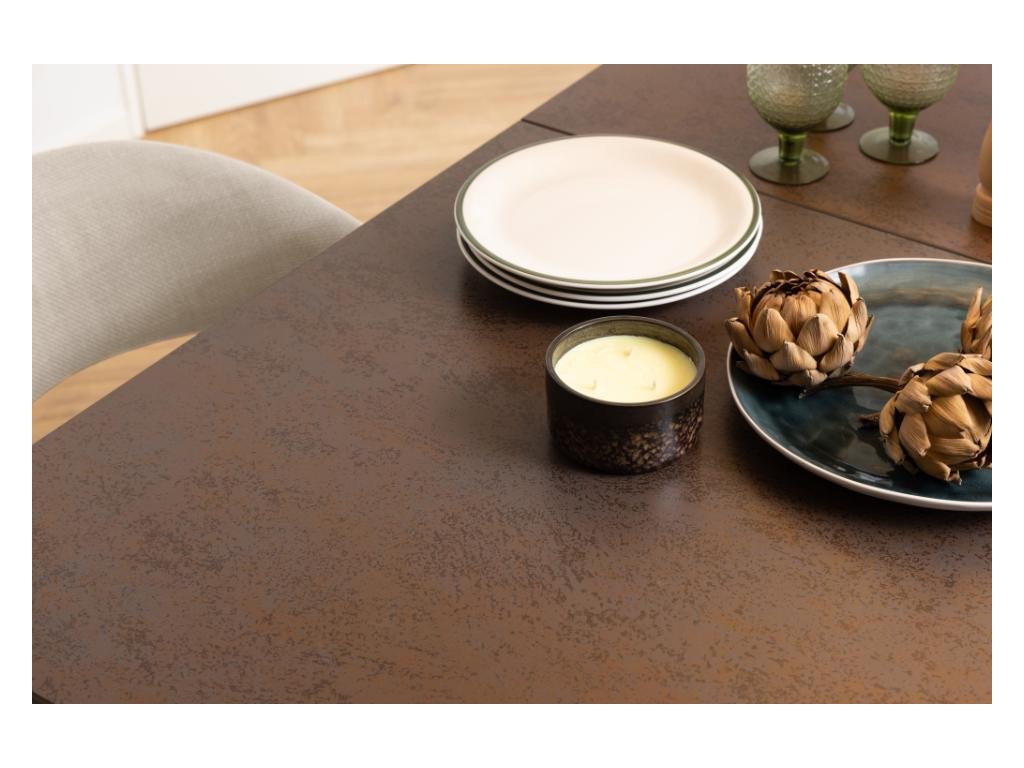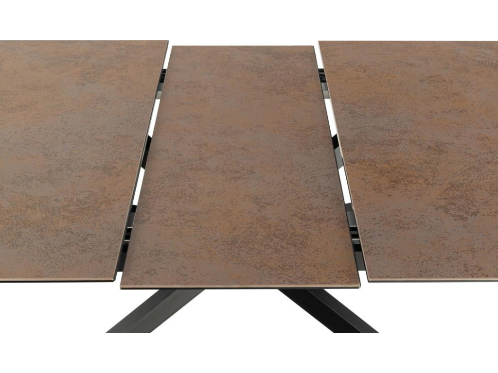 Variant v hrdzavo hnedom tóne pôsobí teplejšie a prirodzenejšie – skvele ladí s rustikálnymi aj modernými interiérmi. Drsná keramická doska má zaujímavú textúru a vysokú odolnosť. Vďaka synchrónnemu výsuvu môžete jednoducho zväčšiť kapacitu stola, pričom matná čierna podnož garantuje stabilitu a štýl.
