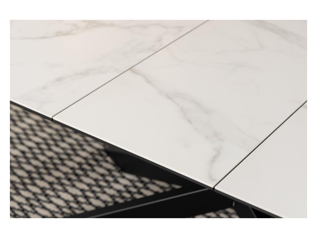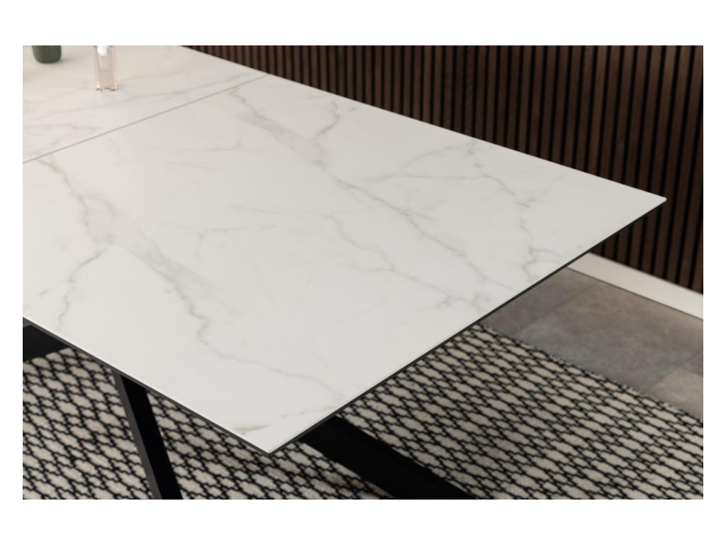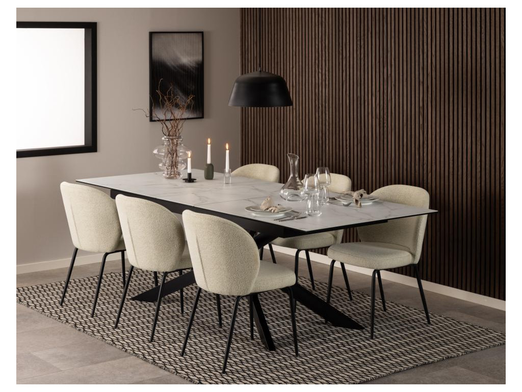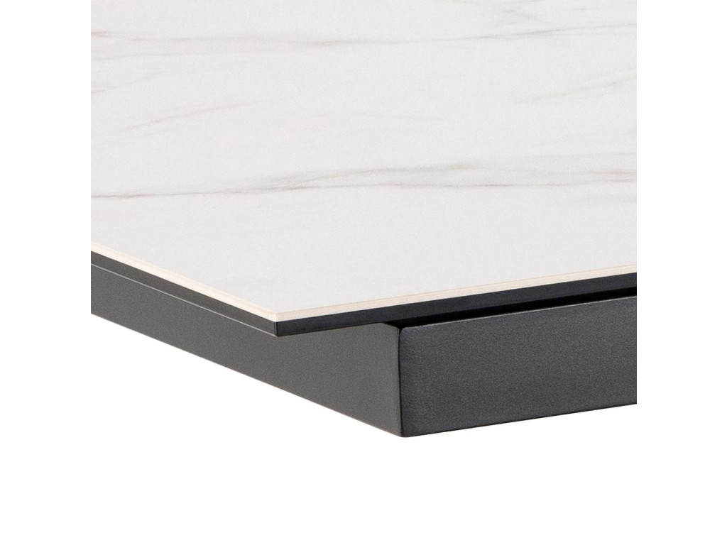 Kombinácia bielej keramickej dosky Akranes s čiernou základňou dodáva stolu nadčasovú eleganciu. Povrch s jemnou textúrou pripomína mramor a zároveň je mimoriadne odolný.