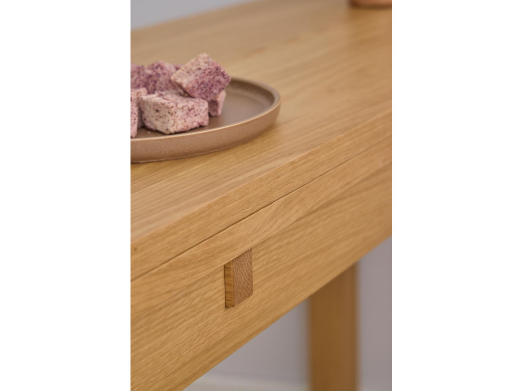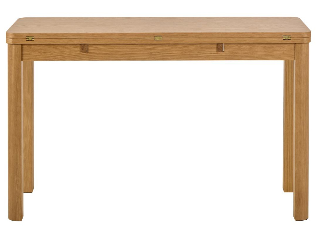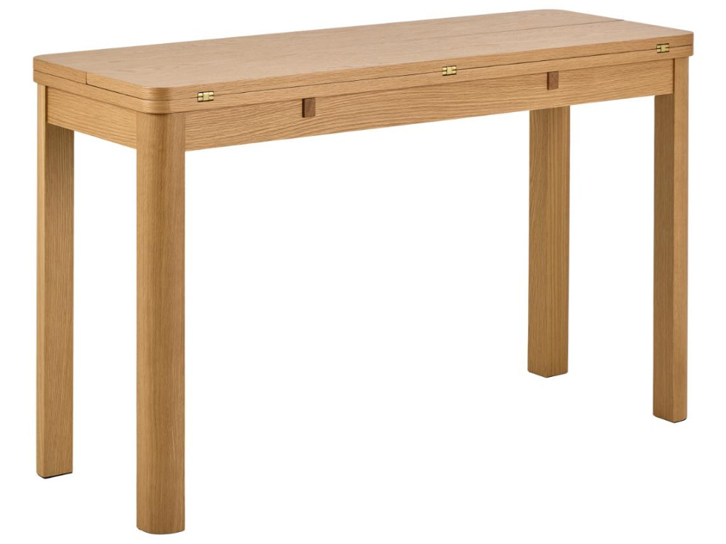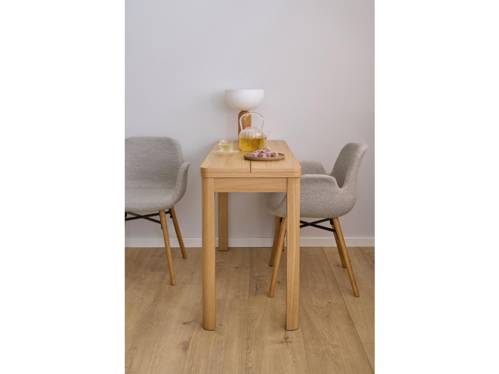 Jednoduchý, praktický a všestranný. Jedálenský stôl Southampton zaujme teplým prírodným vzhľadom matného duba, ale aj funkčnosťou, ktorú oceníte najmä v menších priestoroch. Slúži ako kompaktný jedálenský, pracovný alebo konzolový stôl, a keď príde návšteva, dve výklopné dosky okamžite zväčšia jeho plochu.