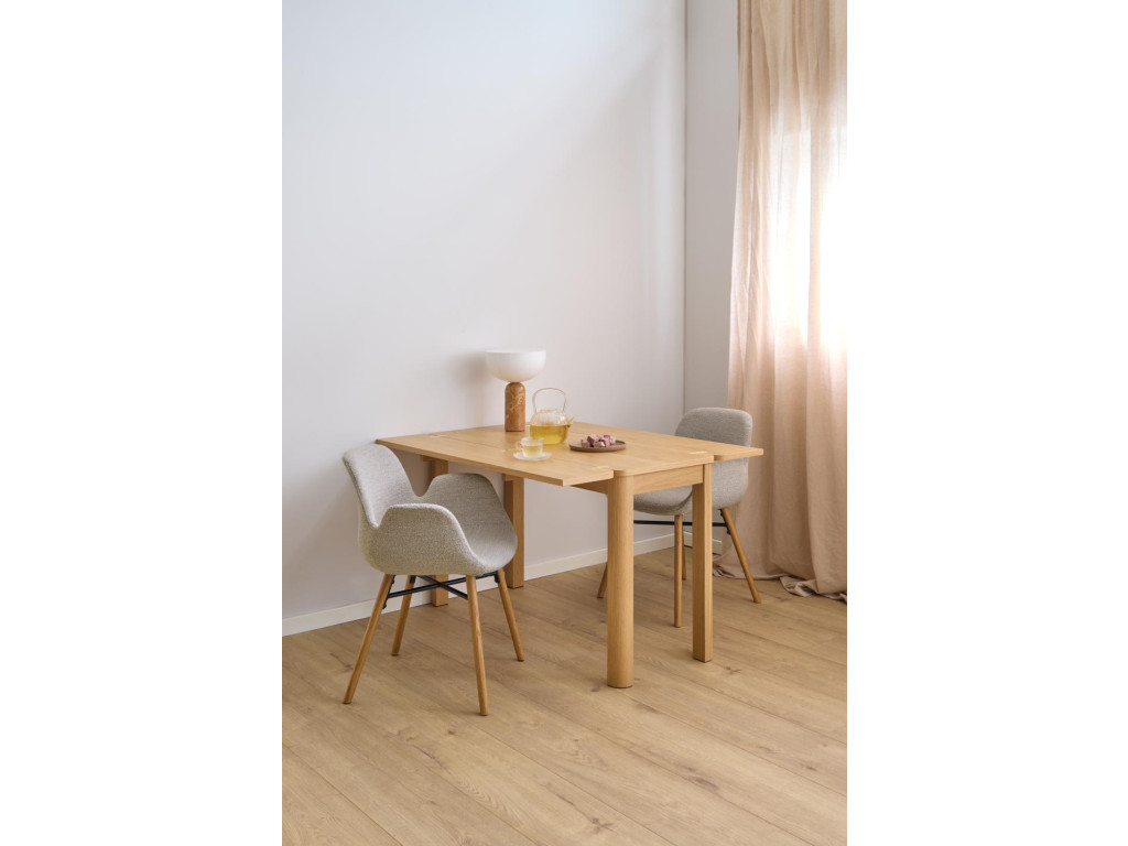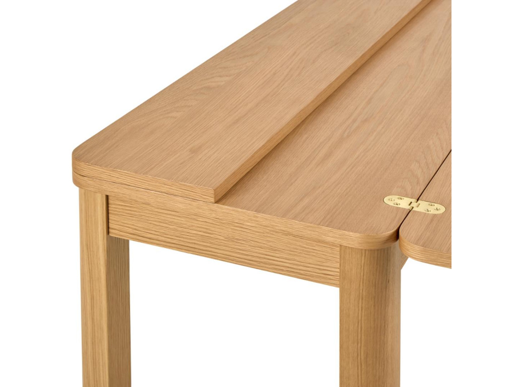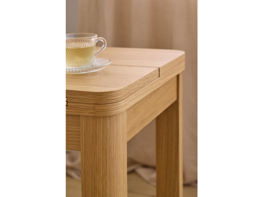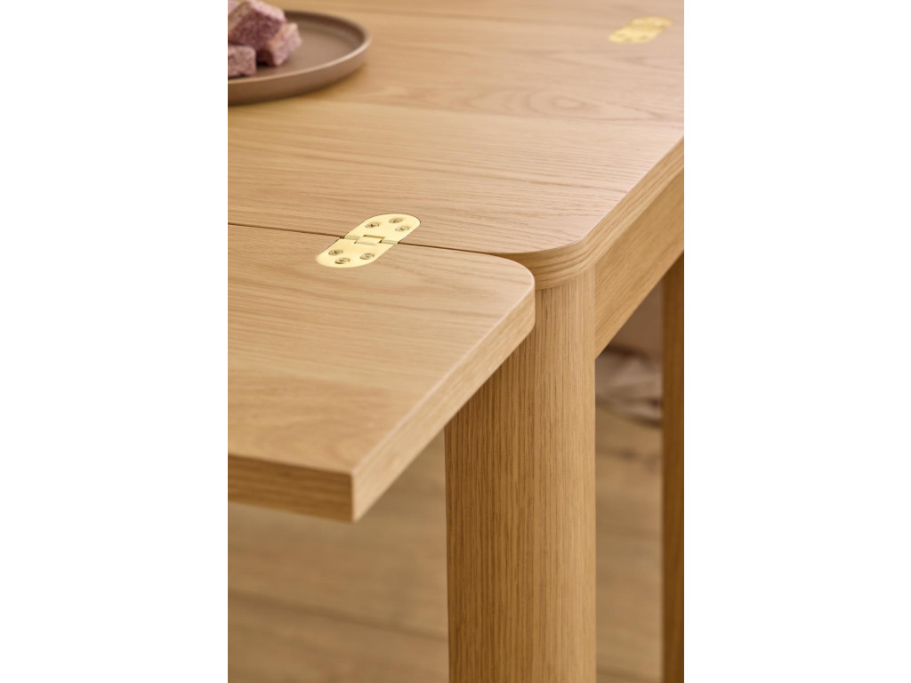 Vrchná doska s PU lakovanou dubovou dyhou je nielen príjemná na pohľad, ale aj odolná voči každodennému opotrebovaniu. Pevná podnož z NC lakovanej dyhy v rovnakom odtieni dotvára jednotný vzhľad. Pánty z brúseného chrómu a integrovaný úložný priestor na výsuvné krídla sú praktické detaily, ktoré oceníte každý deň.