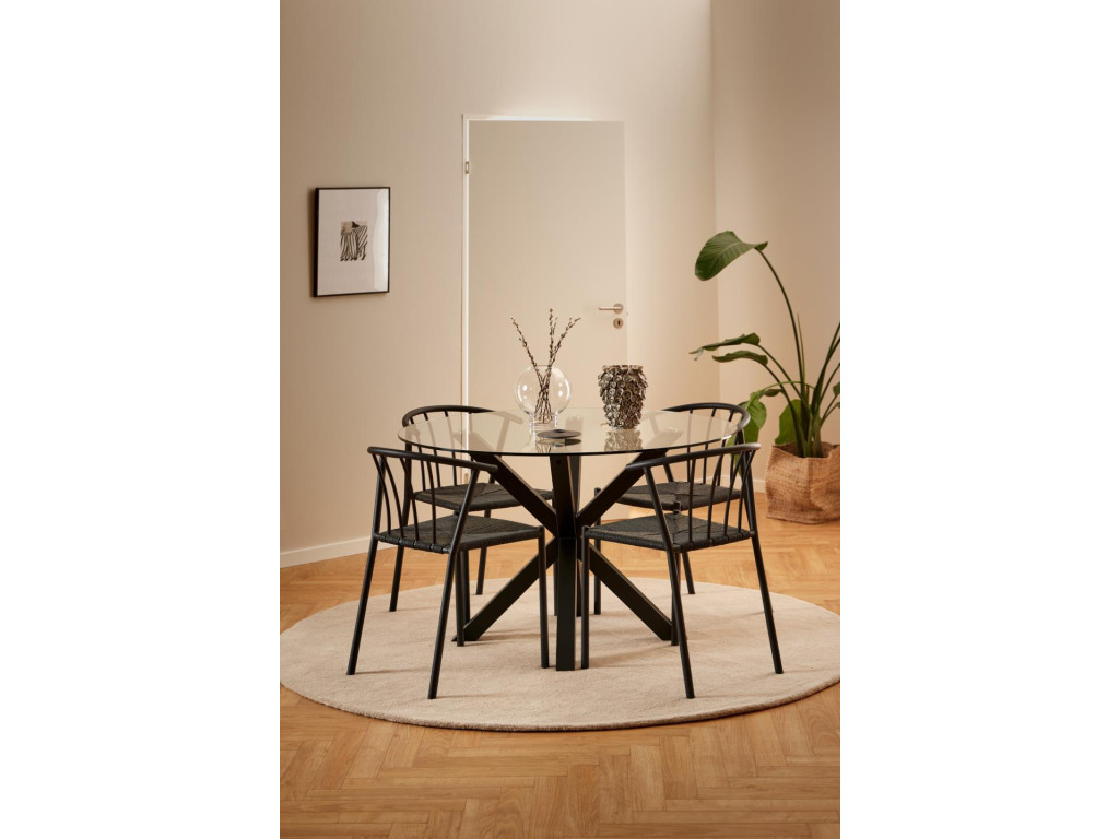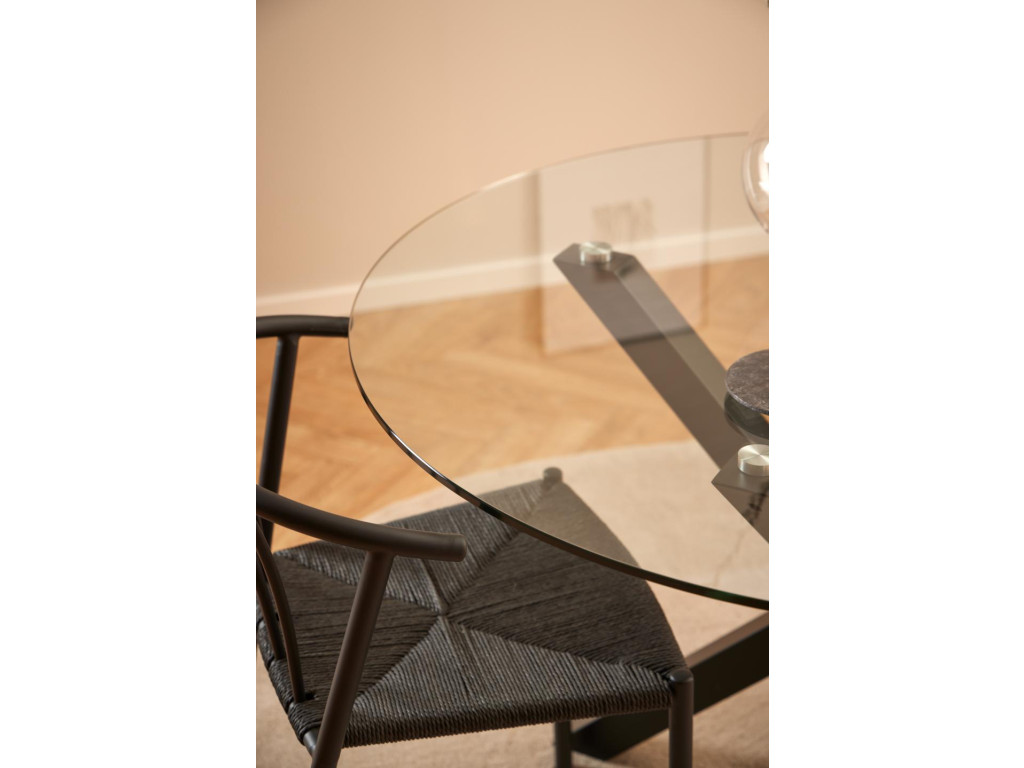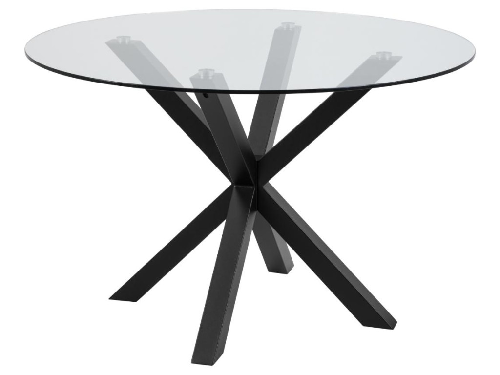 Jedálenský stôl Heaven je dokonalým spojením moderného dizajnu, funkčnosti a ľahkosti. Vďaka čírej doske z tvrdeného skla s priemerom 119 cm pôsobí vzdušne a opticky zväčšuje priestor, zatiaľ čo jeho krížová 4-ramenná podnož z matnej čiernej ocele s hrubým práškovým nástrekom dodáva stolu elegantný a výrazný vzhľad.