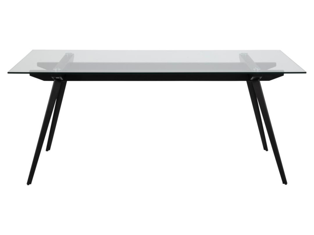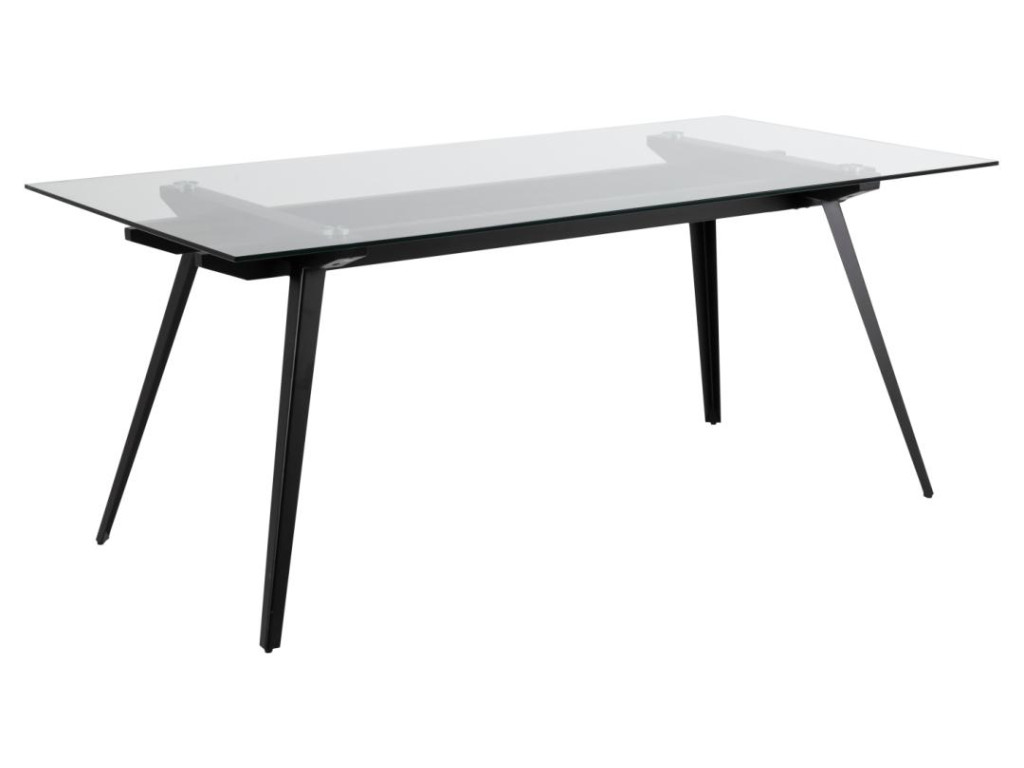 Obdĺžnikový stôl Montik so sklenenou čírou doskou a výraznou matnou čiernou oceľovou základňou dodáva priestoru industriálny vzhľad. Rozmery 180 × 90 × 75 cm poskytujú komfortné miesto pre stolovanie celej rodiny. Odolná konštrukcia a kvalitné materiály zaručujú dlhú životnosť. Skvele sa hodí do moderných jedální a loftových priestorov.