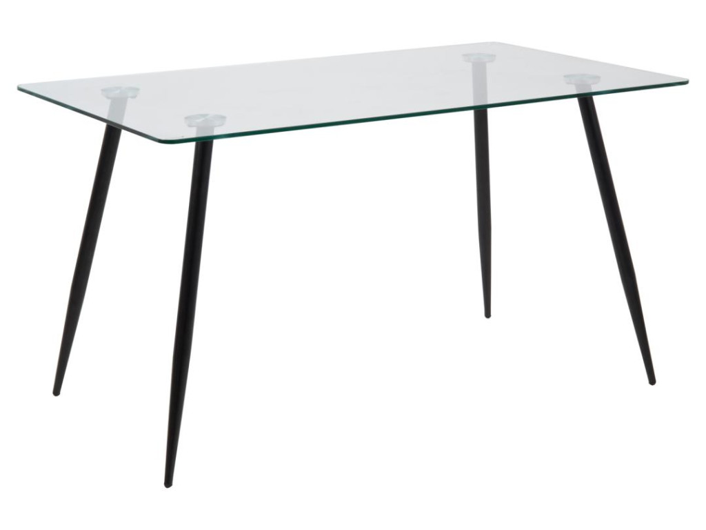 Vzdušný a moderný obdĺžnikový jedálenský stôl s čírou doskou z tvrdeného skla a čiernou oceľovou podstavou s matnou povrchovou úpravou. Jeho rozmer 140 × 80 × 75 cm sa hodí aj do menších interiérov. Ideálny na každodenné stolovanie aj ako dizajnový prvok v priestore. Zabezpečuje eleganciu bez kompromisu na praktickosti.