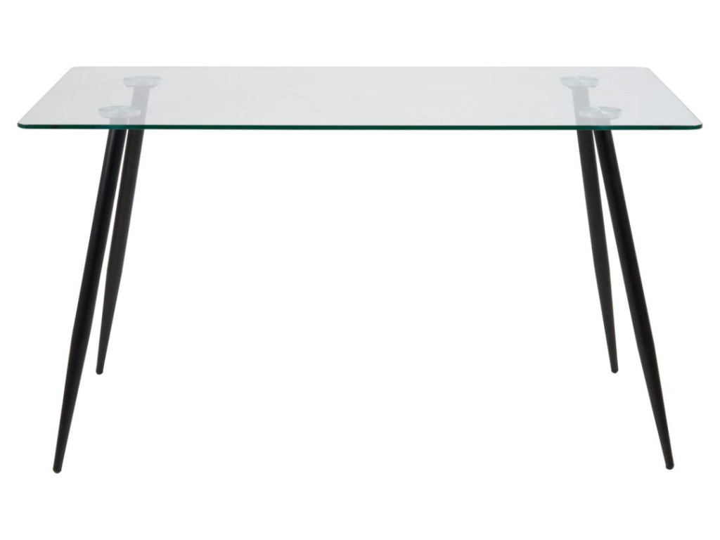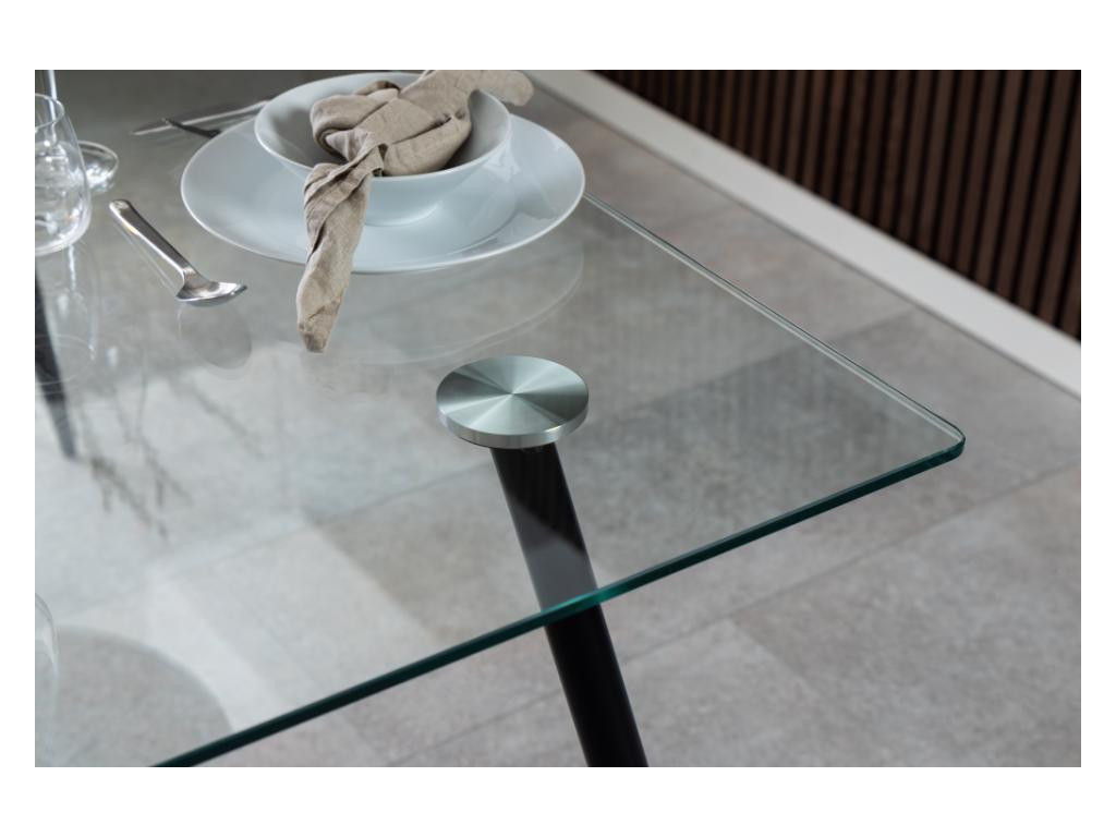 Vzdušný a moderný obdĺžnikový jedálenský stôl s čírou doskou z tvrdeného skla a čiernou oceľovou podstavou s matnou povrchovou úpravou. Jeho rozmer 140 × 80 × 75 cm sa hodí aj do menších interiérov. Ideálny na každodenné stolovanie aj ako dizajnový prvok v priestore. Zabezpečuje eleganciu bez kompromisu na praktickosti.