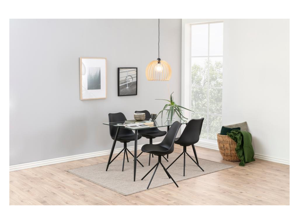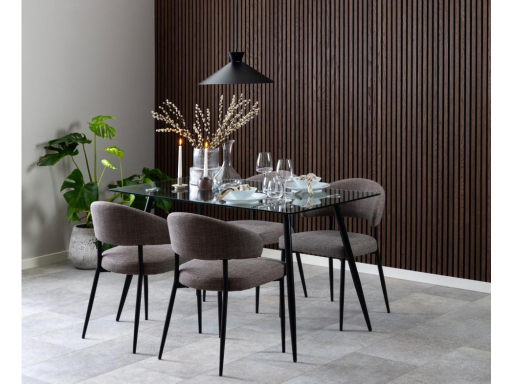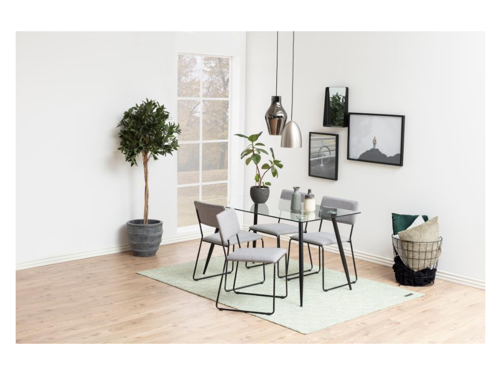 Jedálenský stôl Wilma v sebe spája minimalistický vzhľad a funkčnosť. Vrchná doska z číreho tvrdeného skla pôsobí vzdušne a moderne, vďaka čomu opticky zväčšuje priestor. Podopierajú ju štíhle, šikmé oceľové nohy s čiernym matným práškovým nástrekom, ktoré dotvárajú nadčasový dizajn. Tento stôl je ideálny pre tých, ktorí hľadajú kombináciu estetiky a jednoduchej údržby.