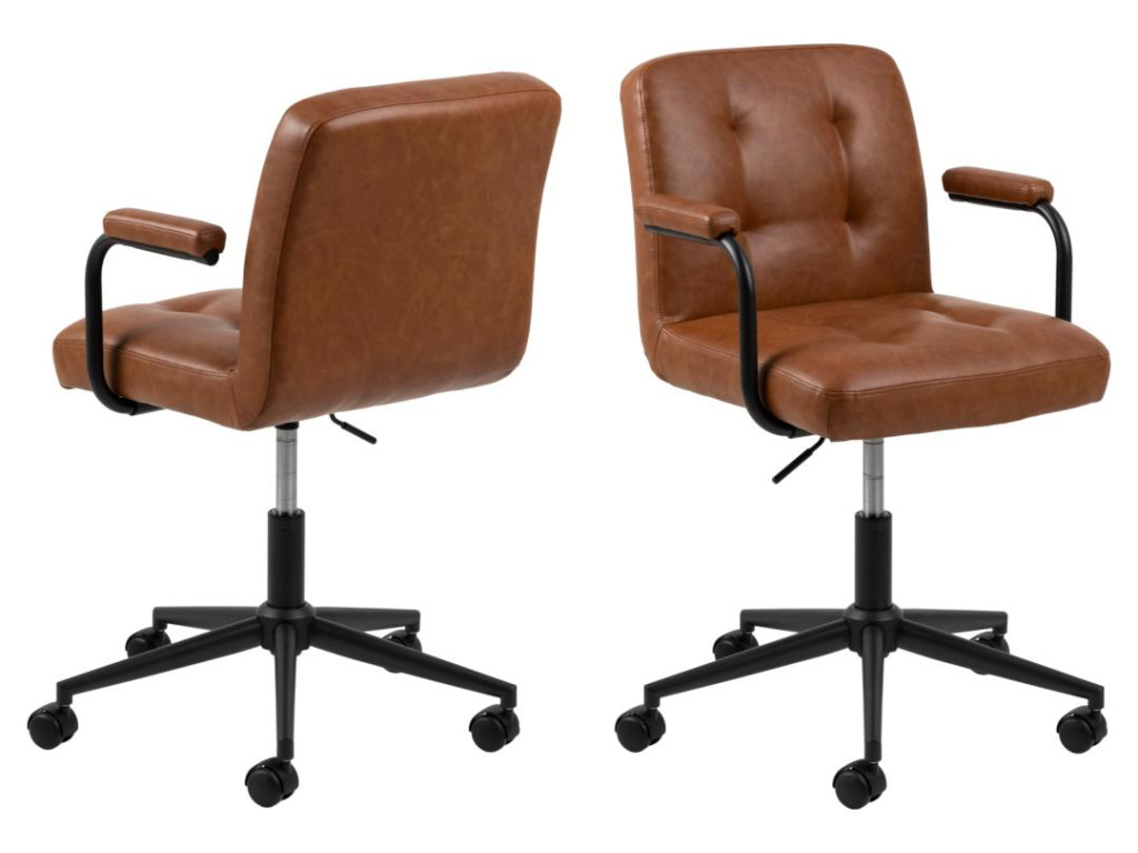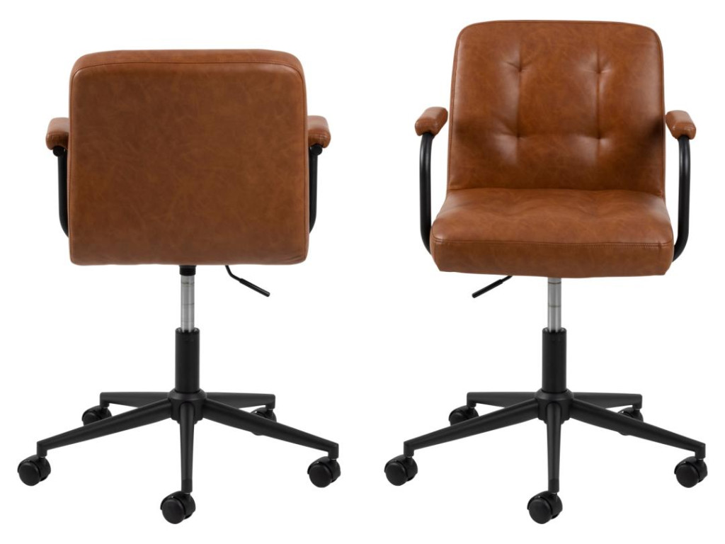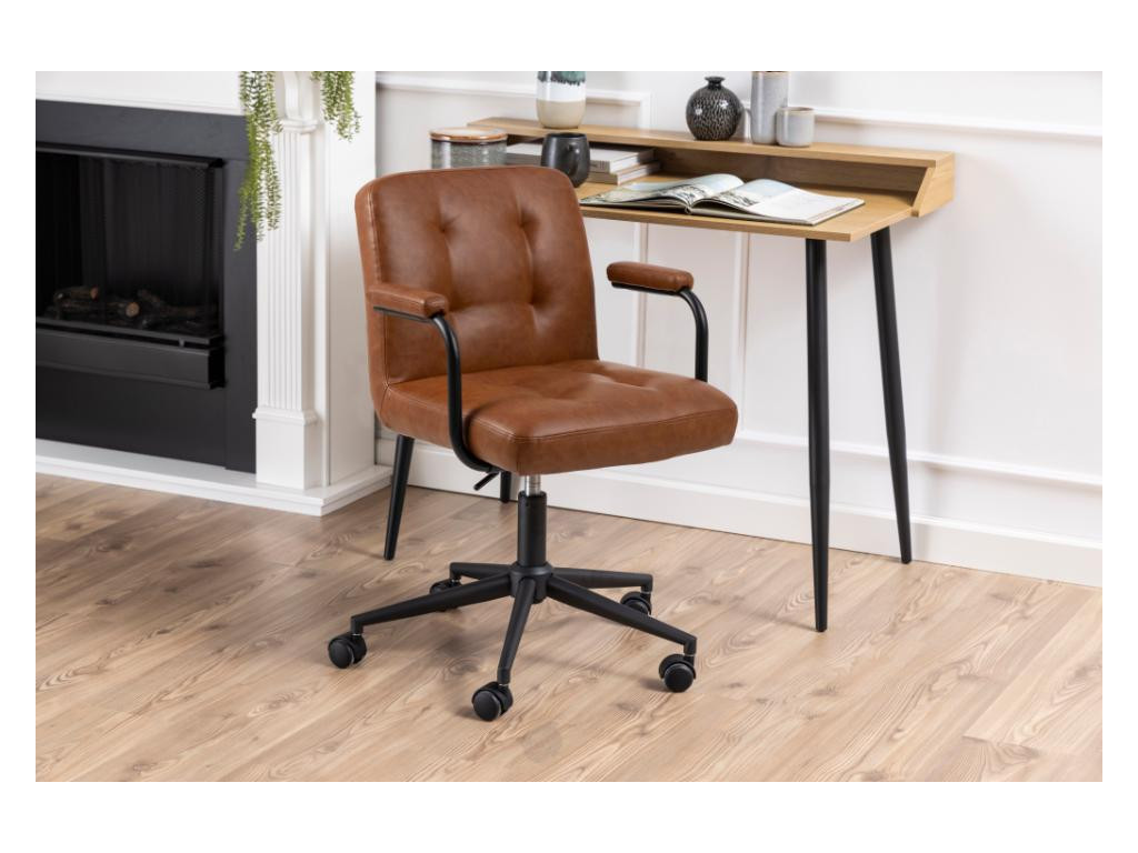 Stolička Cosmo je ideálna do kancelárie vďaka kombinácii komfortného sedenia a retro dizajnu. Hnedá ekokoža pôsobí elegantne a ľahko sa udržiava. Funkčné prvky ako otočný čap, plynový zdvihák a kolieska zabezpečujú pohodlné používanie počas celého dňa.