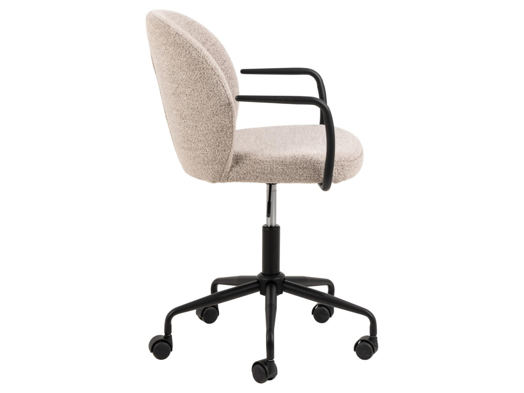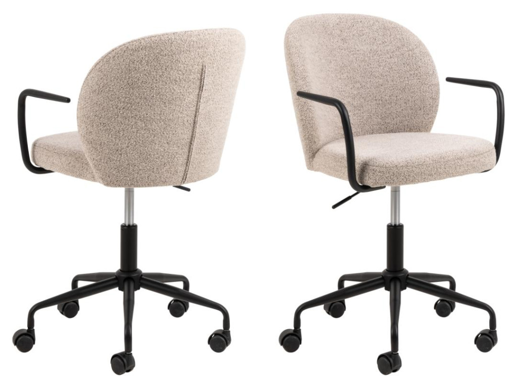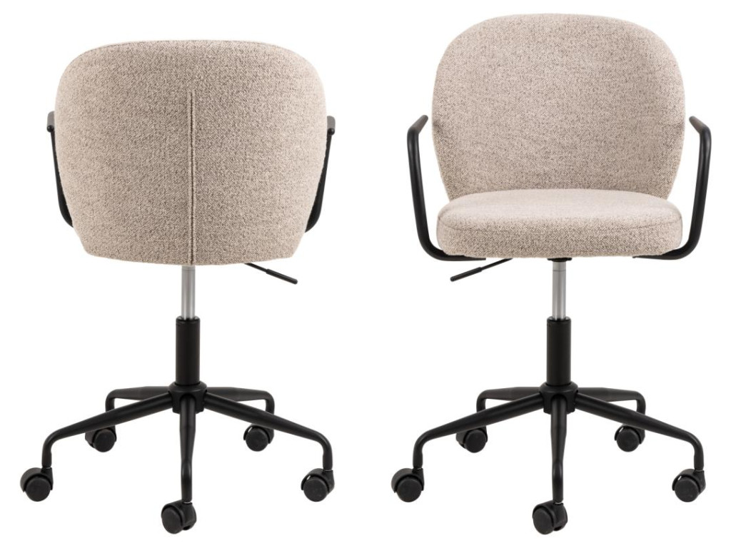 Stolička Patricia prináša funkčnosť a pohodlie pre každodennú kancelársku prácu. Je vybavená mäkkým čalúnením, opierkami a otočnou základňou s plynovým zdvihom. Stabilná čierna podnož s kolieskami zaručuje ľahký pohyb po miestnosti. Kombinácia béžovej látky a čierneho kovu vytvára decentný vzhľad vhodný do každého pracovného priestoru.
