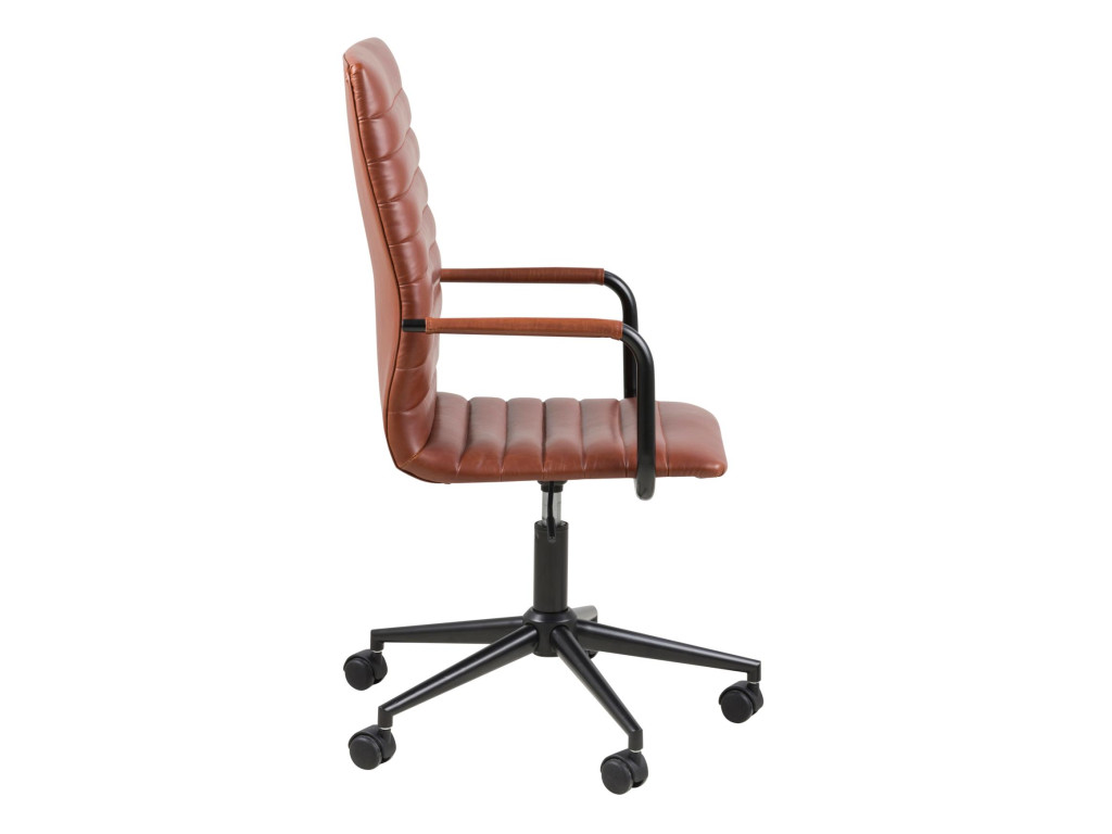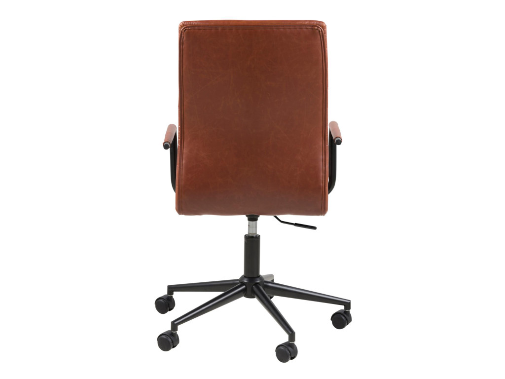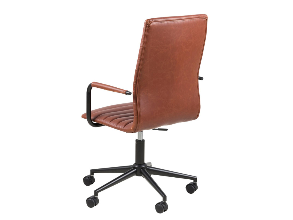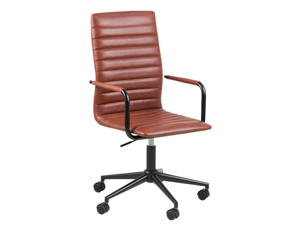 Kancelárska stolička Winslow v elegantnej kombinácii hnedej ekokože a čiernej ocele prinesie štýl aj pohodlie do každého pracovného priestoru. Vysoké operadlo s horizontálnym prešívaním podporuje chrbticu aj počas dlhých hodín sedenia. Otočný mechanizmus, brzdové kolieska a plynový zdvih zabezpečujú vysoký komfort pri každodennom používaní. Vďaka vintage PU poťahu pôsobí stolička sofistikovane a luxusne.