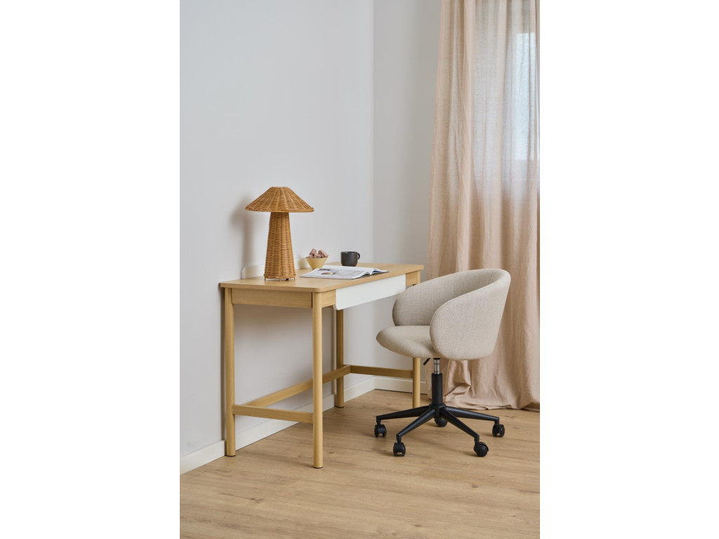 Moderný kancelársky stôl v škandinávskom štýle s dubovou melamínovou doskou, béžovou zásuvkou z MDF a oceľovými nohami s dubovým fóliovaním. Odolný, ľahko udržiavateľný a ideálny pre praktické aj estetické pracovné prostredie.