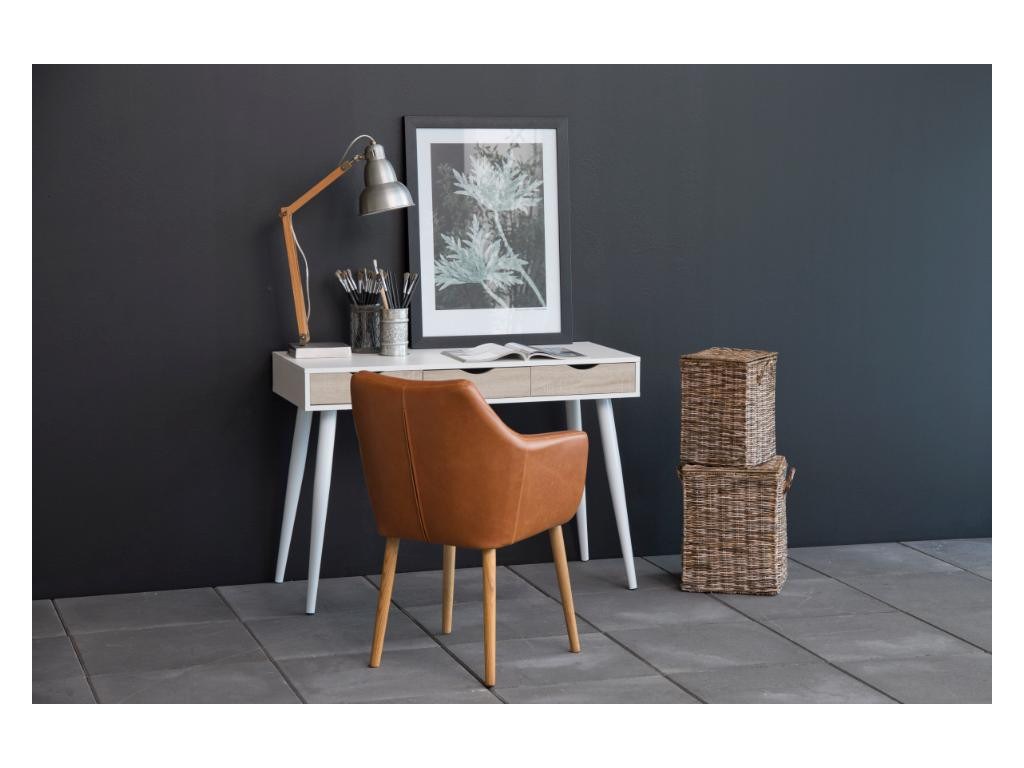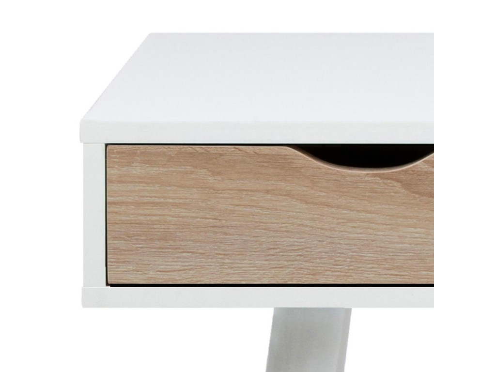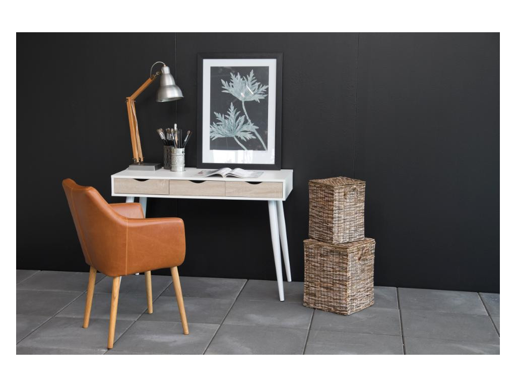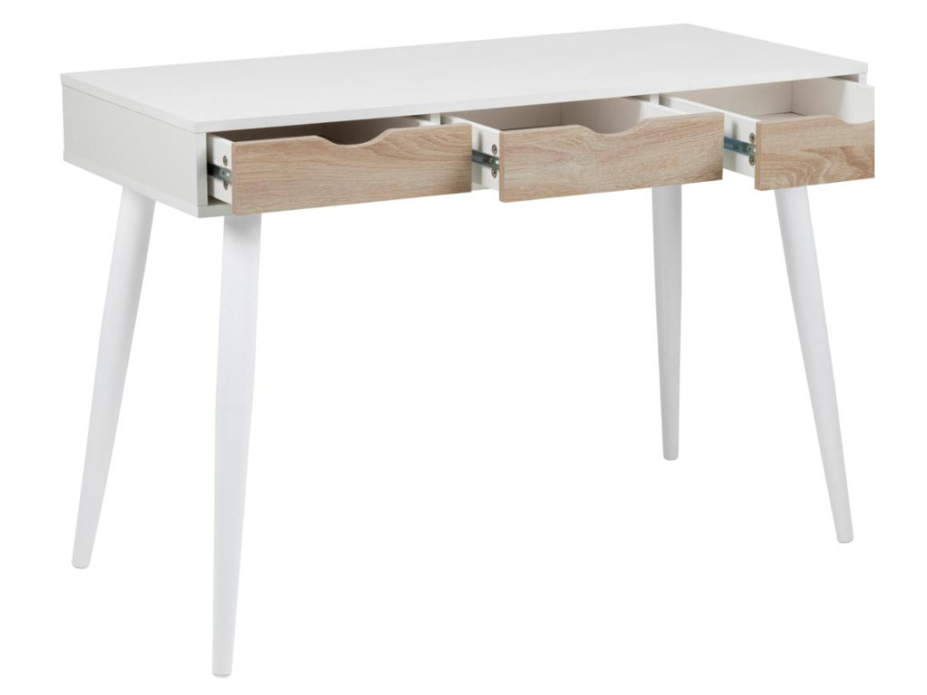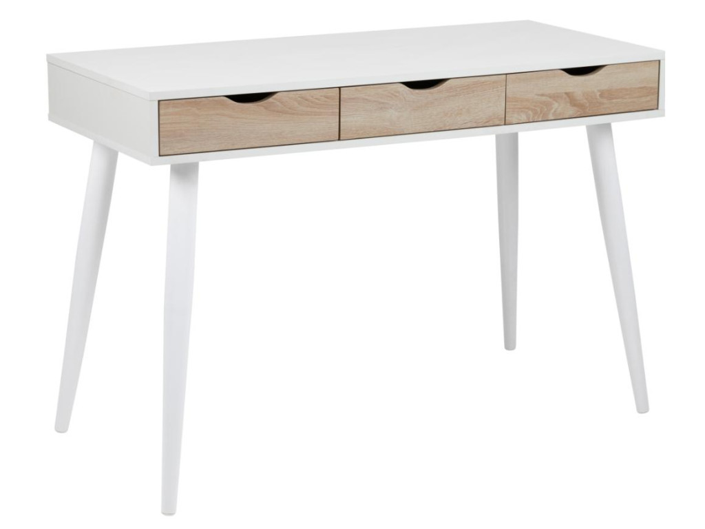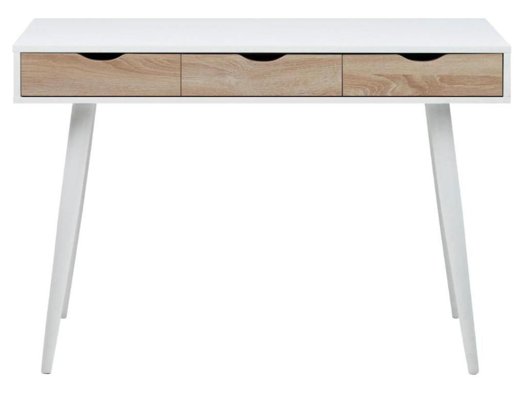 Moderný hranatý pracovný stôl s úložným riešením v podobe 3 zásuviek v dekore dub sonoma. Vrchná doska je vyhotovená z bieleho melamínu, čo zaručuje odolnosť a jednoduchú údržbu. Stabilitu zabezpečuje práškovaná biela oceľová základňa. Vďaka rozmerom 110 × 50 × 77,1 cm je ideálny do študentských izieb aj domácich kancelárií.