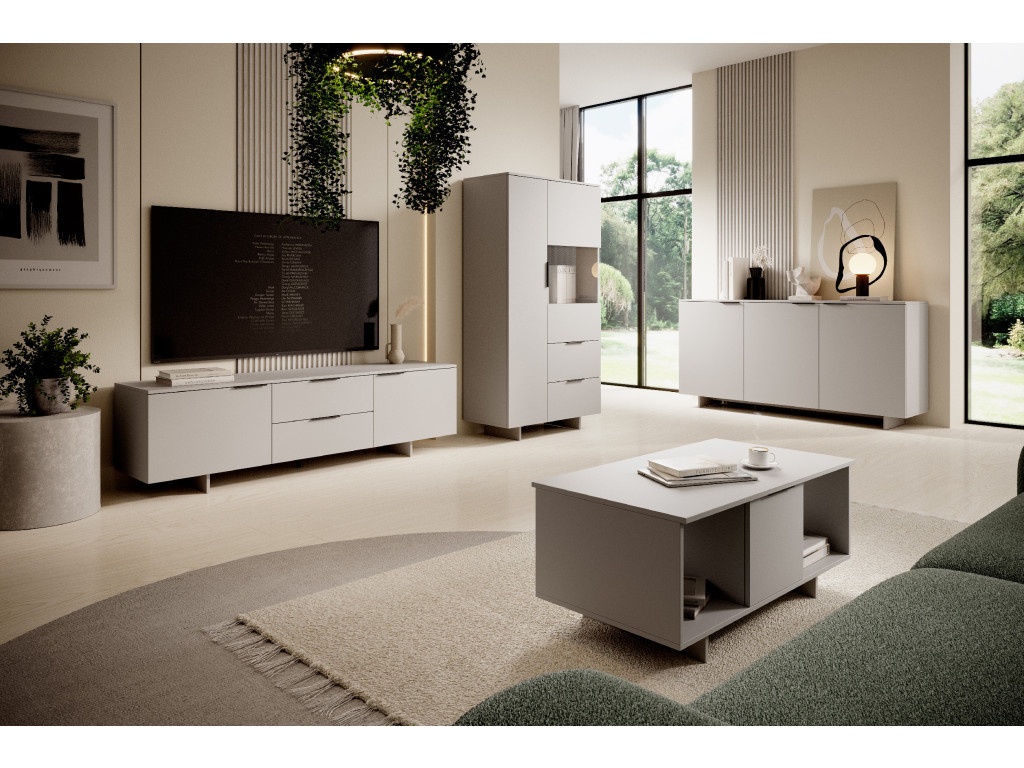 Priestranná vitrína Alma s dvoma dvierkami a dvoma zásuvkami ponúka veľkorysý úložný priestor pre rôzne predmety. Vďaka svojmu elegantnému dizajnu a praktickému riešeniu je nielen funkčná, ale aj štýlový doplnok do každého interiéru.