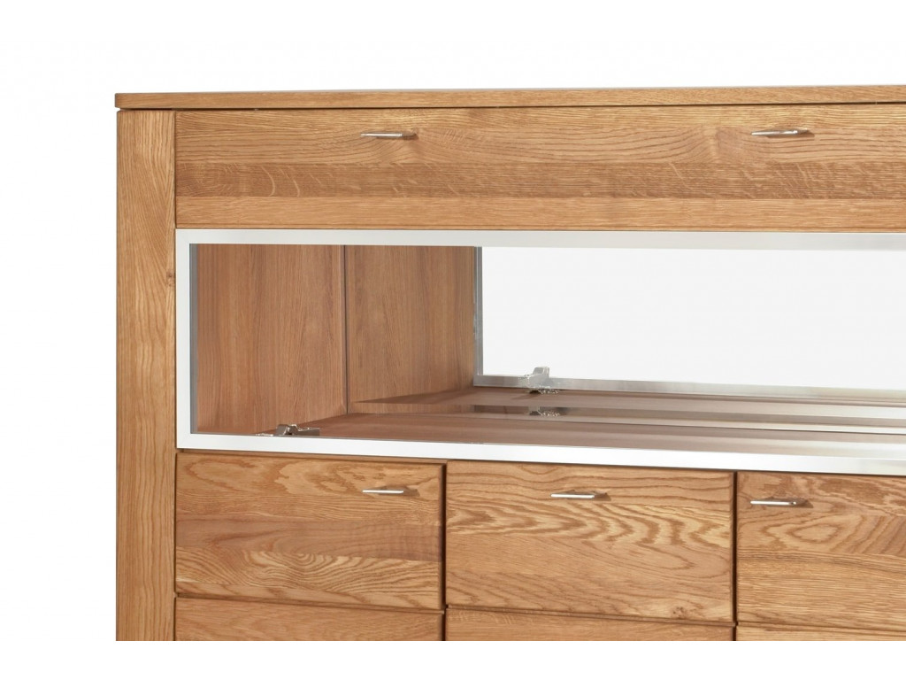 Hľadáte prvok do obývačky, ktorý bude plniť praktickú aj dizajnovú funkciu? Vitrína Latina 48 je kúskom, ktorý pritiahne oči nejednej návšteve. Vitrína disponuje 9 policami za dvierkami a presklenou policou navrchu, ktorá sa otvára smerom nadol. Vitrína je vyrobená z kvalitnej nábytkovej dosky a dubového dreva, ktoré v miestnosti vytvorí príjemnú elegantnú atmosféru.