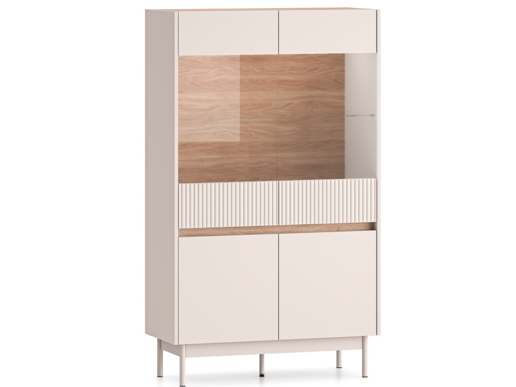 Vitrína Dunea 03 v kašmírovo béžovej a dekore dub krémový je ideálnym nábytkom pre tých, ktorí hľadajú elegantné riešenie na vystavenie aj uskladnenie. Horná presklená časť s policou umožní vystaviť dekorácie či riad, spodná časť poslúži na praktické uloženie. Stabilné kovové nožičky a možnosť doplniť LED osvetlenie podčiarkujú štýl vitríny. Vďaka tichému zatváraniu dvierok je jej používanie príjemné a komfortné. Skvelo sa hodí do moderných aj klasických interiérov.