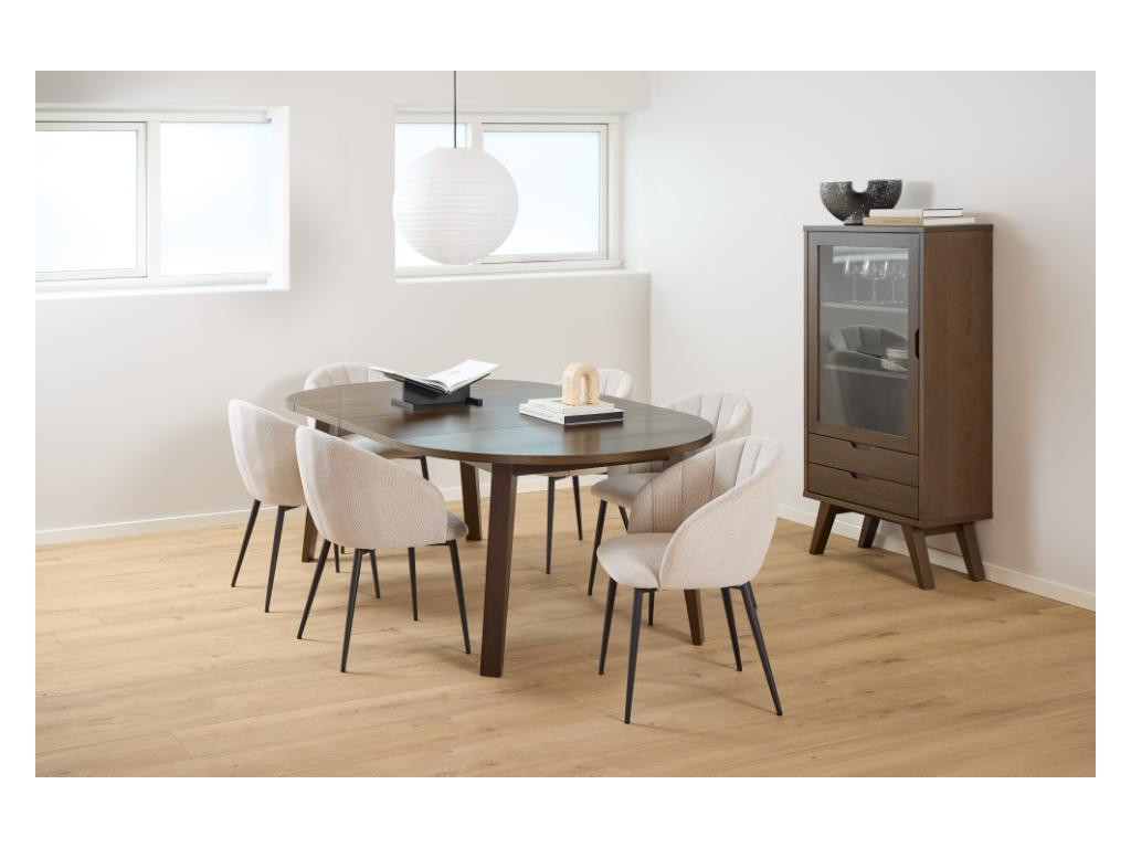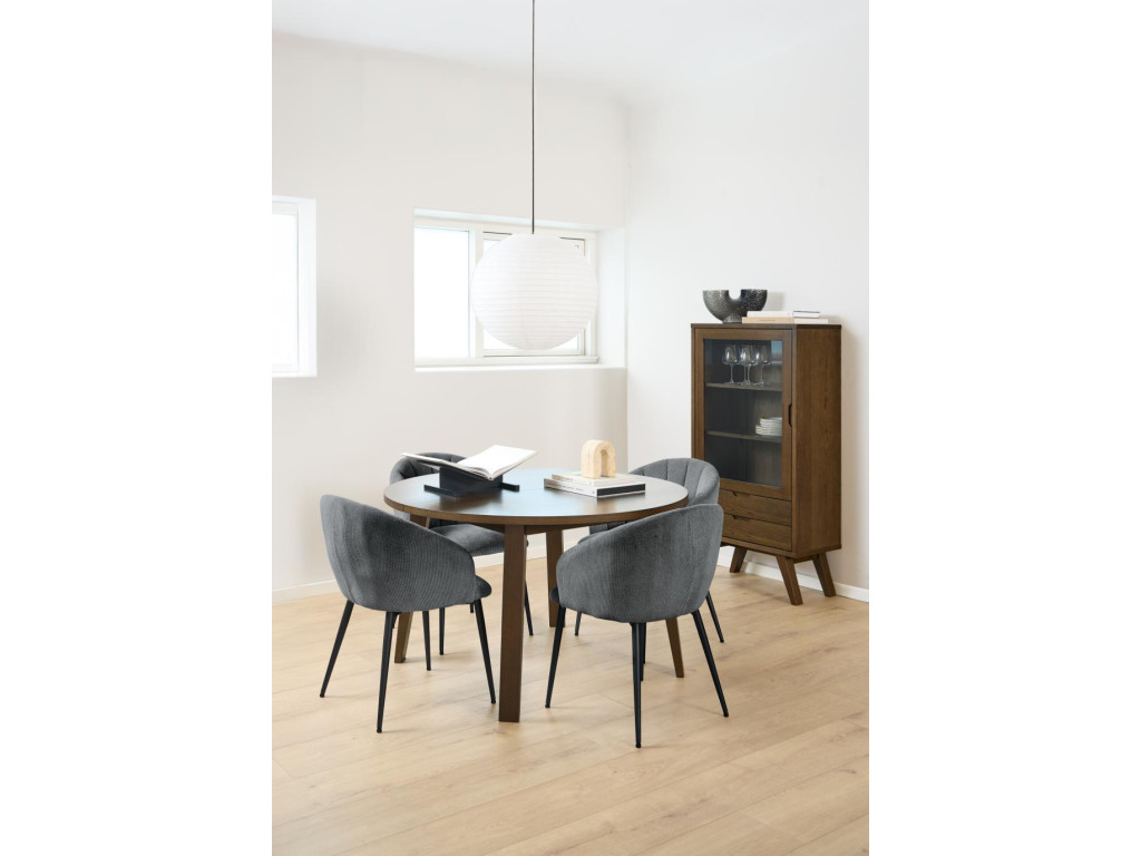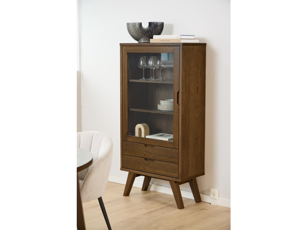 Vitrína A-Line v dymovej dubovej dyhe kombinuje funkčnosť s estetickým vzhľadom. Dvierka z číreho skla umožňujú vystaviť vaše obľúbené dekorácie alebo porcelán, zatiaľ čo zásuvky ponúkajú praktický úložný priestor. Elegantný dizajn podčiarkuje kvalitná povrchová úprava a jemné detaily. Vhodná do obývačky či jedálne ako dominantný prvok.