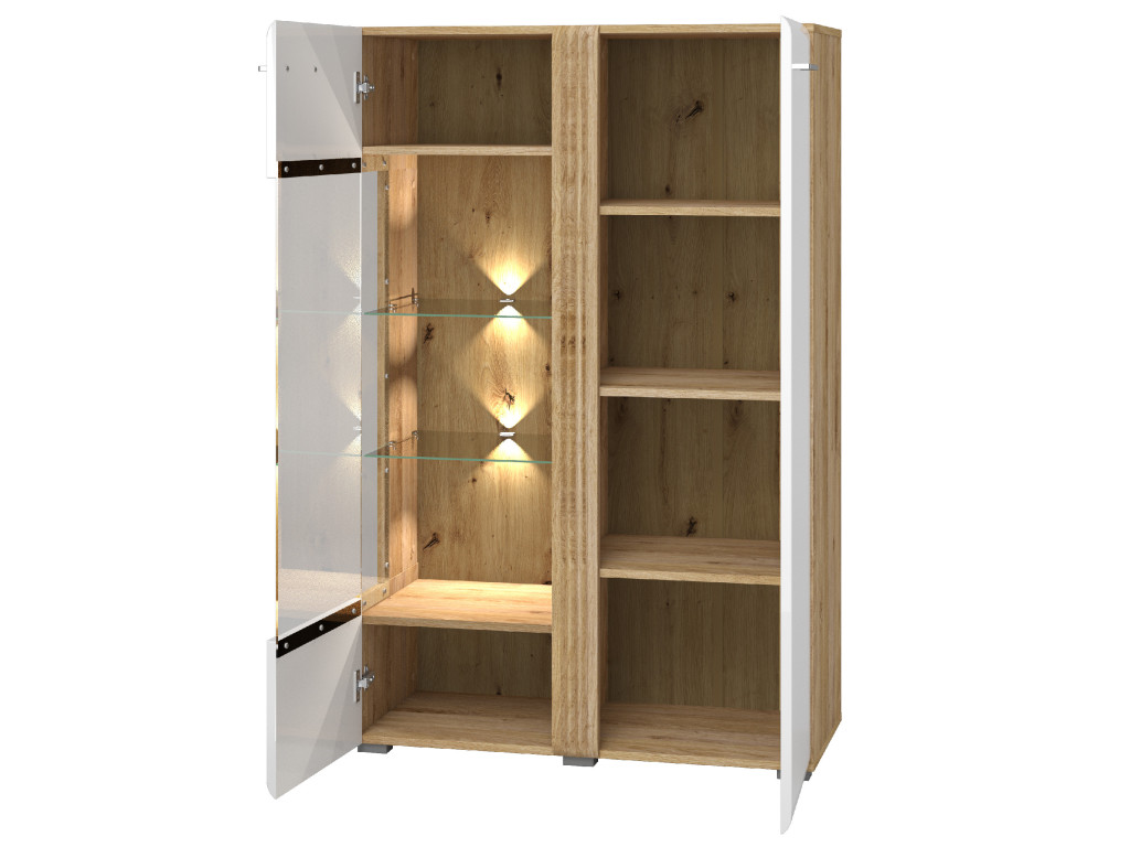 Dvojdverová vitrína Adagio 03L je elegantný a funkčný doplnok s moderným štýlom. Ľavá strana dverí je presklená, čo umožňuje krásne vystaviť obľúbené predmety či dekorácie. Vnútorný priestor ponúka päť pevných políc z dosky a dve sklenené police s možnosťou doplnenia osvetlenia za doplatok, pre atmosférický efekt. Táto vitrína spája praktickosť s nadčasovou eleganciou, vďaka čomu sa dokonale hodí do každého moderného interiéru.