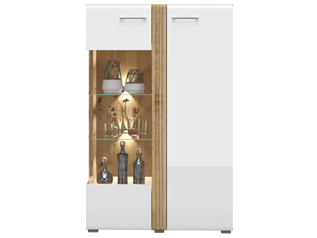 Dvojdverová vitrína Adagio 03L kombinuje moderný biely lesk s teplým dekorom dub castello, čím dodáva priestoru elegantný nádych. Presklená ľavá strana dverí umožňuje vystaviť dekorácie, na dvoch sklenených policiach, ktoré možno doplniť osvetlením, a zvyšné police za plnými dverami určite ukryjú vaše poklady, prípadne dokumenty. Táto kombinácia farieb a materiálov prináša do interiéru štýl a lesk.