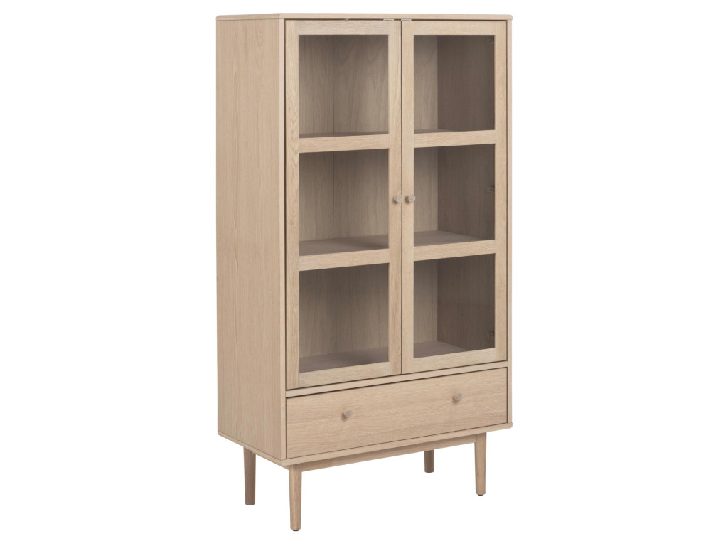Vitrína Aston spája prírodnú krásu dubového dreva s jemným bielym pigmentom a čistou eleganciou skla. Je ako stvorená pre tých, ktorí túžia po škandinávskom štýle s moderným nádychom. Kombinácia masívneho duba, dubovej dyhy a tvrdeného skla vytvára harmonický celok, ktorý zaujme na prvý pohľad. Vnútro ponúka dve priestranné police na vystavenie dekorácií či riadu, zatiaľ čo zásuvka s hladkým výsuvom diskrétne ukryje menšie predmety.