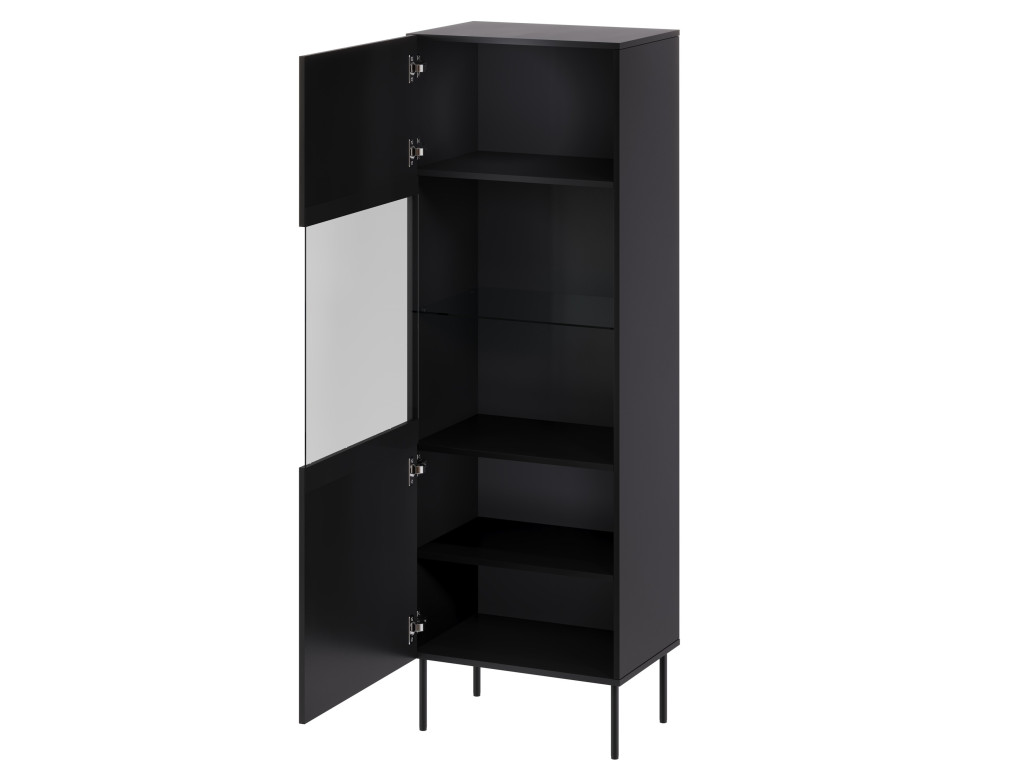 Štýlová vitrína Isla v čiernom prevedení s rozmermi 60 × 40 × 180 cm ponúka 3 drevené a 1 sklenenú policu, frézované dvierka a PUSH TO OPEN systém. Kovové nohy (20 cm) dodávajú moderný charakter a ľahkosť.