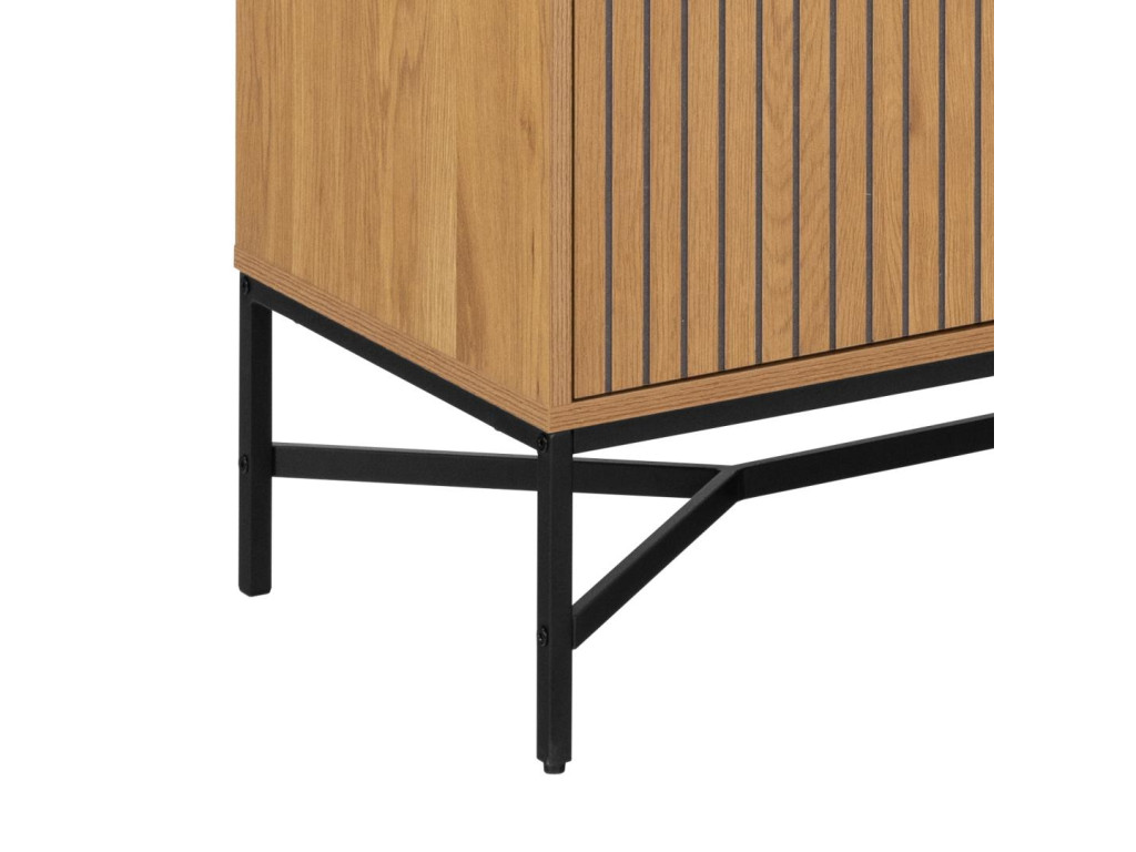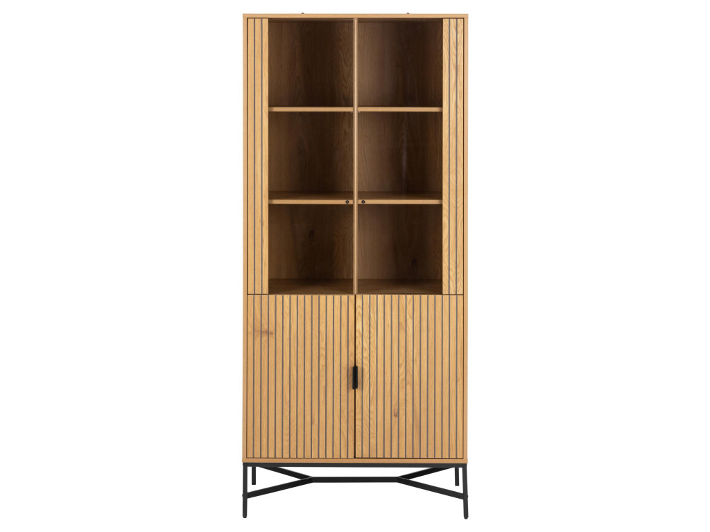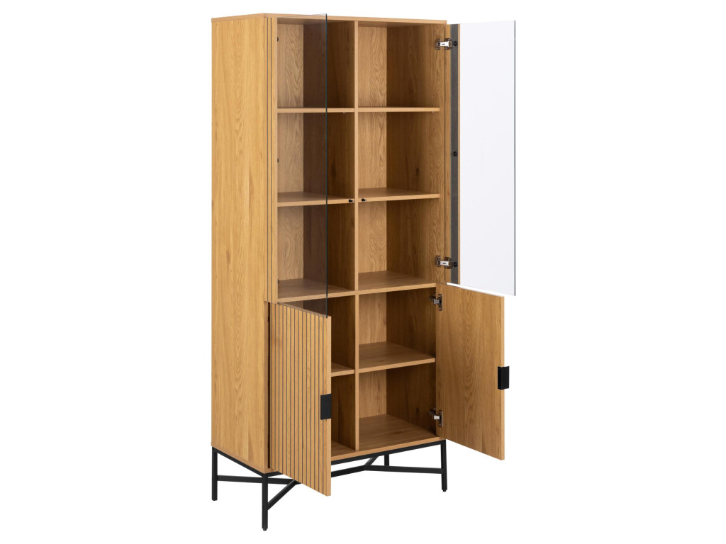 Vitrína Jaipur ponúka kombináciu otvoreného a uzavretého úložného priestoru v nadčasovom dizajne. Dekor divokého duba a čierna oceľová základňa vytvárajú prirodzený kontrast. Sklenené dvierka sú ideálne na vystavenie obľúbených kúskov.