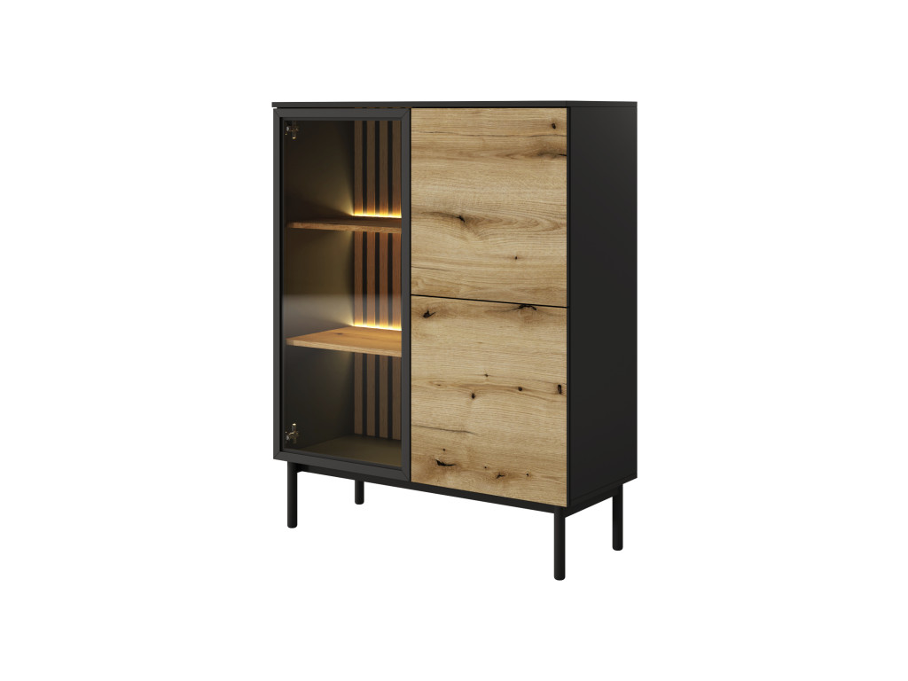Vitrína z kolekcie nábytku Lang je rozdelená na pravú a ľavú stranu. Na ľavej strane vitríny sa za sklenenými dvierkami nachádzajú 2 podsvietené police a na pravej strane sú dvierkami 3 priestranné police. Moderná vitrína je v čiernej - dub evoke farbe.