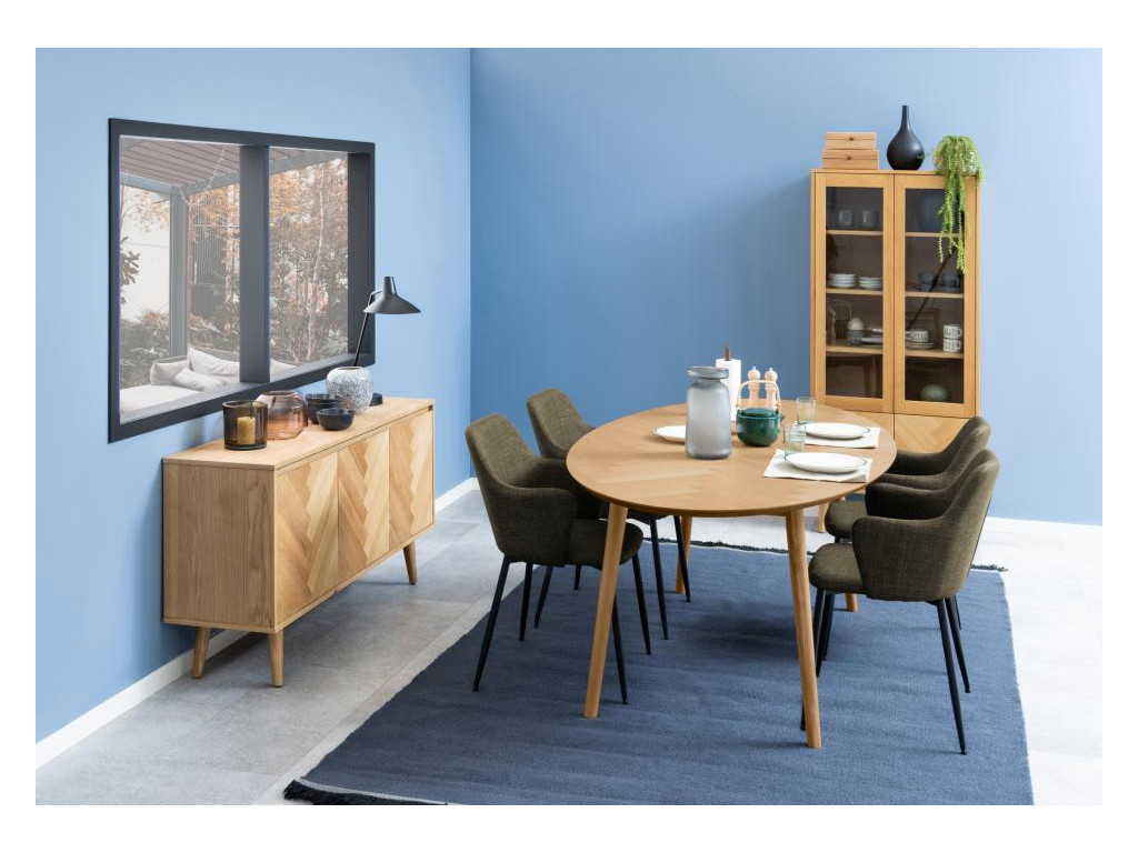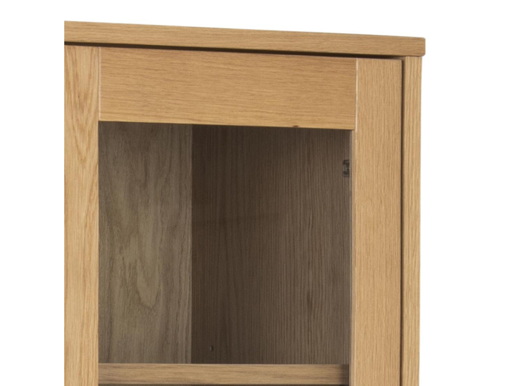 Vitrína Nagano je kombináciou prírodného dubu a skla, ideálna na vystavenie obľúbených kúskov. S rybou kosťou a UV lakovanou povrchovou úpravou pôsobí sofistikovane. Poskytuje úložný priestor za dvierkami i v otvorených policiach.
