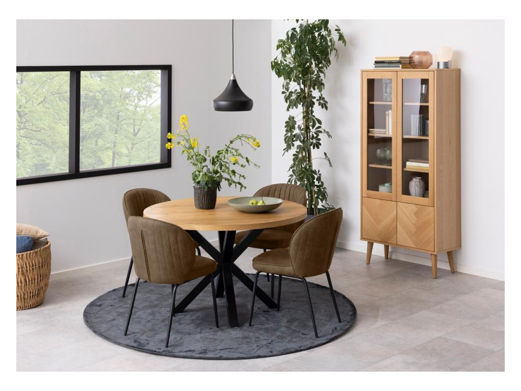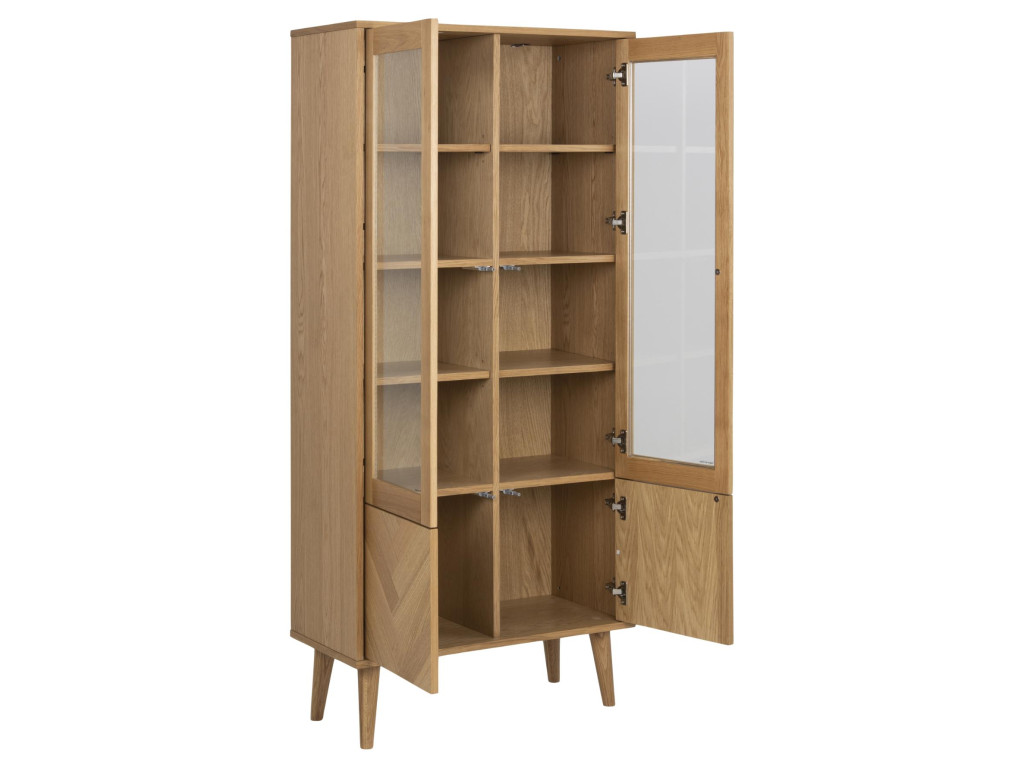 Vitrína obsahuje šesť políc, z ktorých niektoré sú nastaviteľné, vďaka čomu si môžete vnútorné usporiadanie prispôsobiť podľa veľkosti a typu uložených predmetov. Ideálna na riad, dekorácie alebo knihy – skrinka poskytuje veľkorysý priestor a zároveň zostáva vzdušná a elegantná. Podnož z masívneho dubu je zakončená praktickými plastovými krytkami, ktoré chránia vašu podlahu. Tento kúsok si nájde miesto v každej moderne ladenej domácnosti.