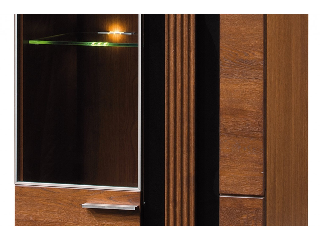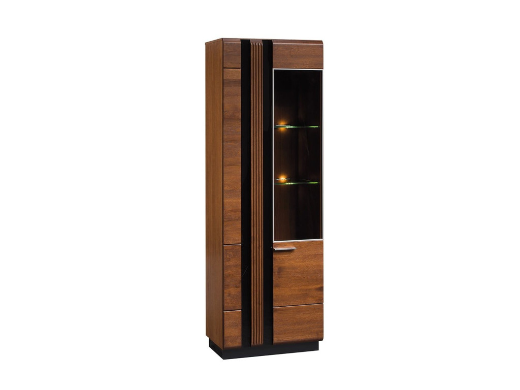 Kombinácia farby "čokoládový dub" so sýtou čiernou robí vitrínu z kolekcie Porti originálnou a elegantnou. Je dokonalým doplnkom ako do klasických izieb, tak aj do interiérov s osobitým charakterom. Vďaka užitočnej forme do nej ľahko schováte veľa vecí a zároveň vystavíte módne doplnky.