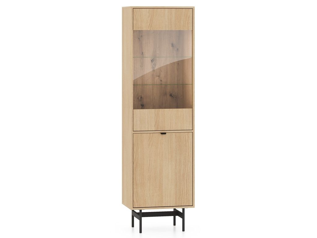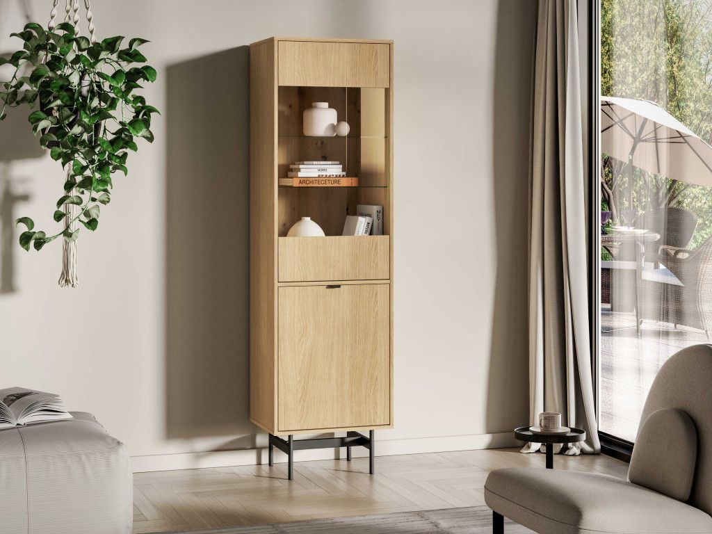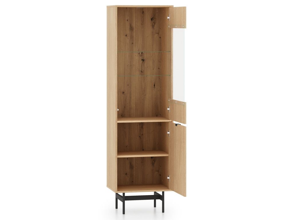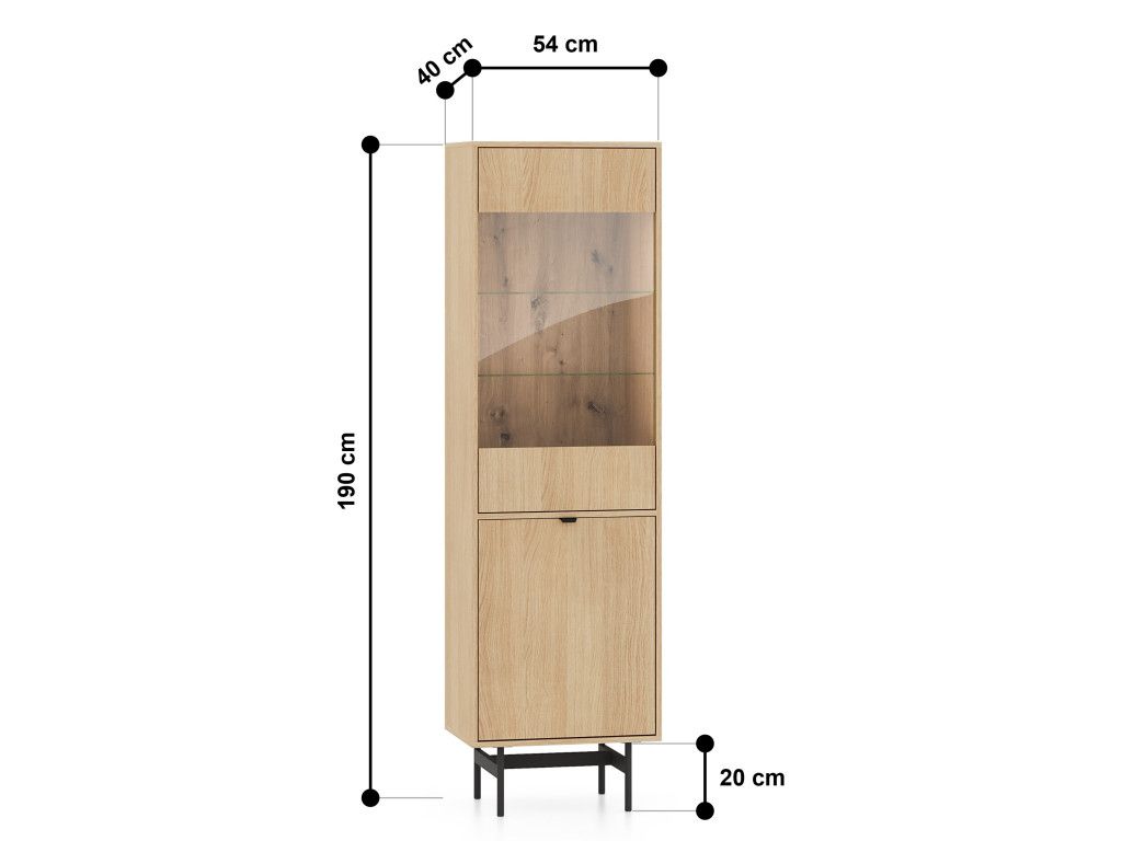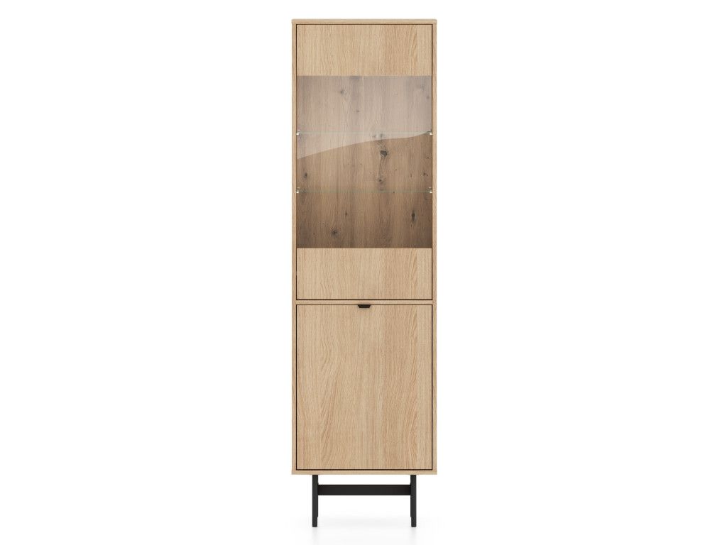 Vitrína Reynos 02 v dekore dub mavelie spája elegantný dizajn s praktickým využitím priestoru. Presklená časť umožňuje vystaviť dekorácie či knihy, zatiaľ čo spodná skrinka ponúka skrytý úložný priestor. Kombinácia dreva a čiernej kovovej podnože dodáva nábytku moderný, vzdušný vzhľad. Samozrejmosťou je tiché dovieranie dverí a systém push to open pre pohodlné používanie. Možnosť doplniť LED osvetlenie zvýrazní vystavené predmety a dodá interiéru prémiový efekt.