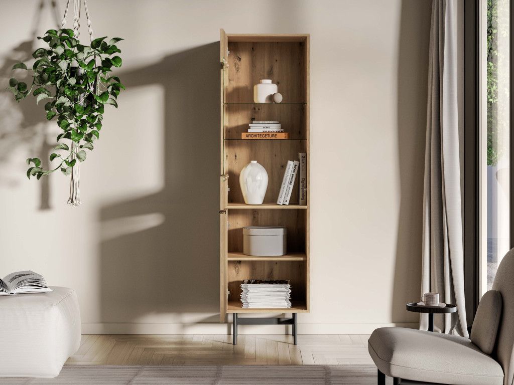 Vysoká vitrína Reynos 02 je ideálna na štýlové vystavenie obľúbených dekorácií, skla alebo kníh. Horná časť s presklenými dverami chráni obsah pred prachom a zároveň ho elegantne prezentuje. Spodná, uzatvorená časť ponúka praktický úložný priestor napríklad na textílie alebo doplnky. Vitrína je osadená na vysokej kovovej podnoži, ktorá dodáva ľahkosť a uľahčuje údržbu podlahy.