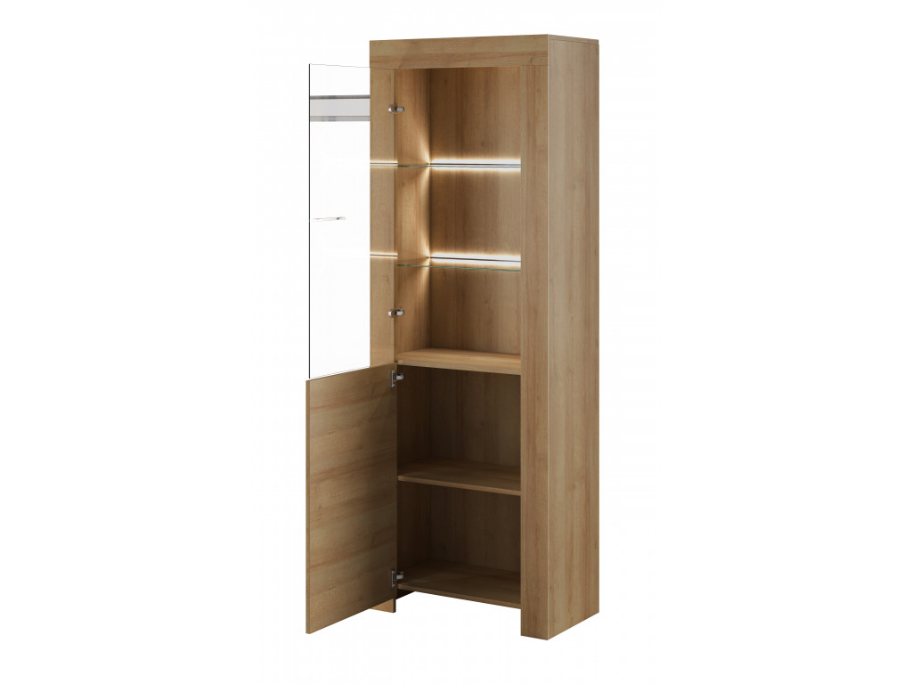 Vysoká vitrína Sky je elegantným kusom nábytku. Vyniká veľkým úložným priestorom v podobe 4 políc, z ktorých sú dve viditeľné za presklenými dvierkami. Možnosťou je ak dokúpenia LED osvetlenia, ktoré je možné vložiť do 2 presklených políc. Vďaka tomu bude komoda pôsobiť elegantne. Komoda je vyrobená vo farbe dub riviera takže zapadne do každého interiéru. Dvierka zdobia úchytky v hliníkovej farbe.