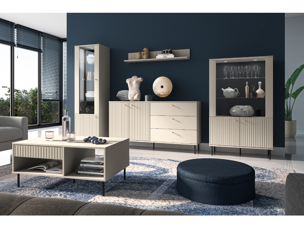 Vitrína Sophie 03 s LED osvetlením a dvoma sklenenými policami ponúka elegantný priestor na vystavenie dekorácií. Kašmírovo béžový dekor, frézované čelá, zlaté úchytky a čierne nožičky pridávajú vitríne moderný štýl a funkčnosť.