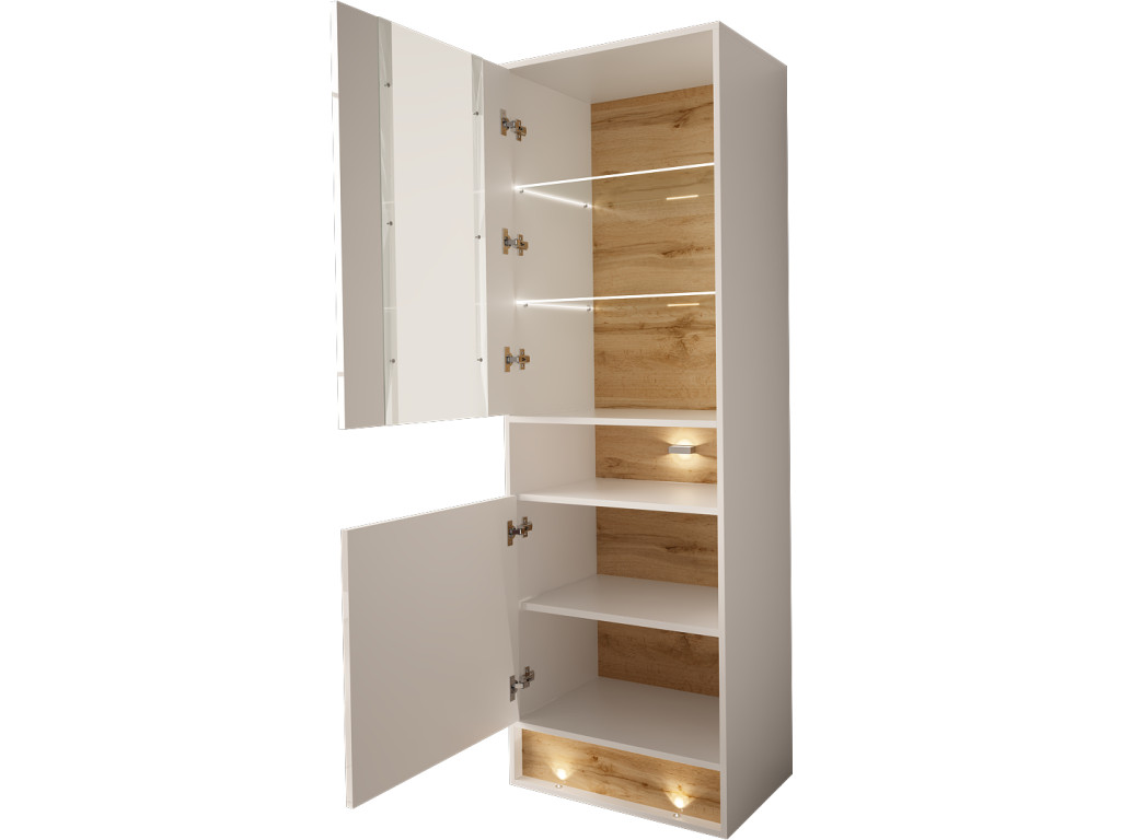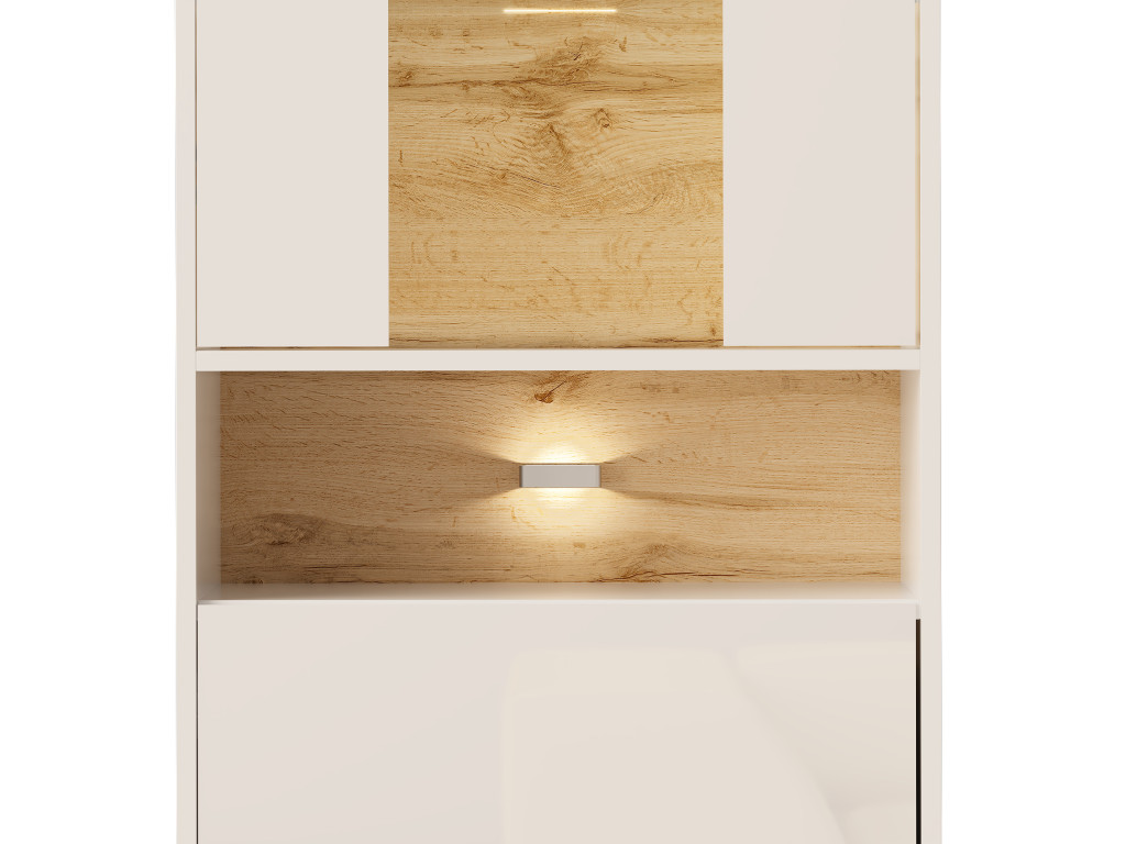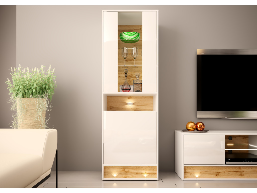 Elegantná vitrína s hornými sklenenými dvierkami, dvoma sklenenými policami, ktoré sú osvetlené, a praktickými spodnými dvierkami na uloženie. Otvorená polica so svetlom a osvetlená spodná lišta dodávajú moderný a útulný vzhľad. Kombinácia bieleho lesku a dekoru dub wotan z nej robí štýlový doplnok do každého interiéru.