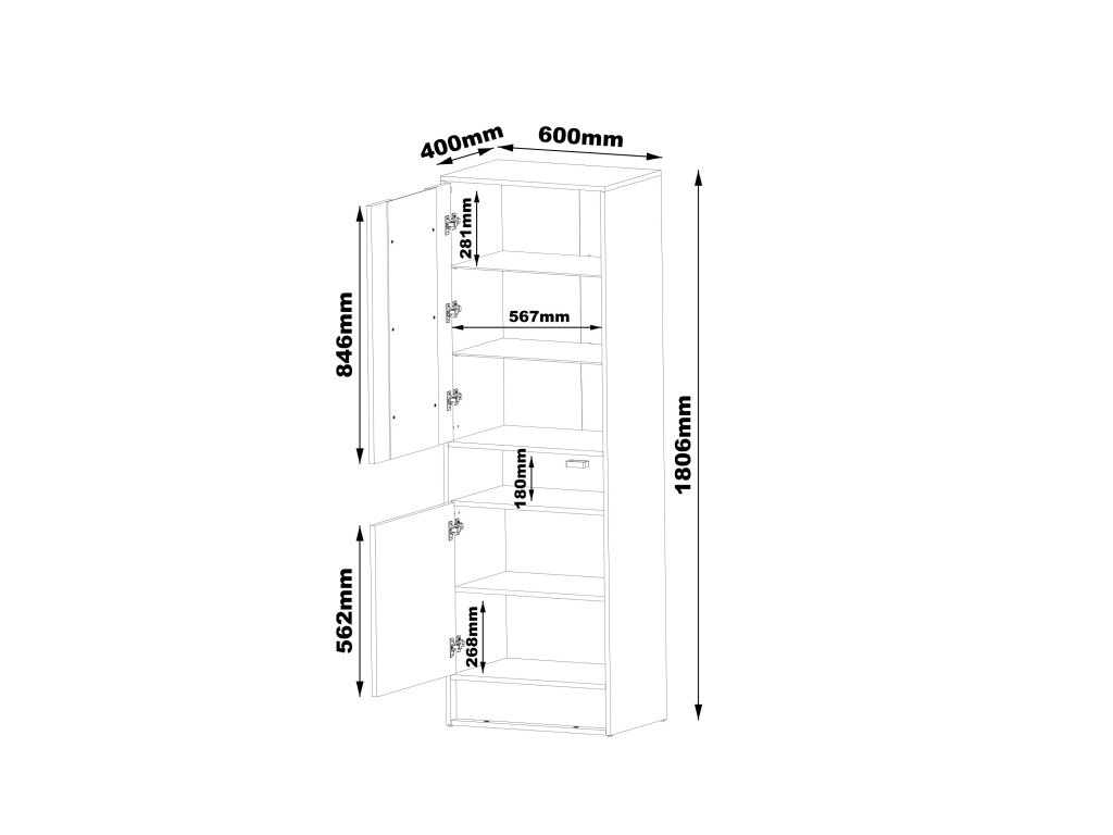 - Korpus: Matný biely povrch z laminovanej DTD s hrúbkou 16 mm dodáva nábytku ľahkosť a elegantný vzhľad.