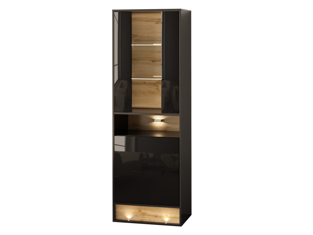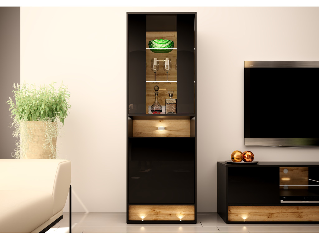 Moderná vitrína s hornými sklenenými dvierkami, dvoma osvetlenými sklenenými policami, otvorenou osvetlenou policou a praktickými spodnými dvierkami. Podsvietená spodná lišta dopĺňa moderný dizajn a dodáva interiéru útulnosť. Kombinácia čierneho lesku a dekoru dub wotan je ideálnou voľbou pre elegantné a štýlové priestory.