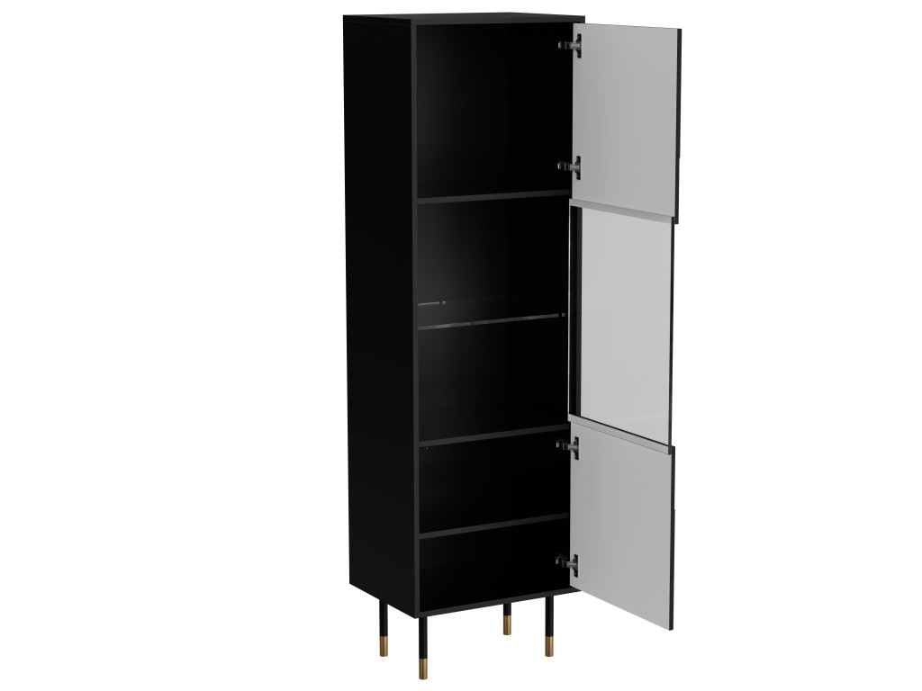 Vysoká vitrína Mountain so šírkou 54 cm a výškou 180 cm je štýlový solitér, ktorý vynikne v obývačke, pracovni aj jedálni. Za presklenými dvierkami nájdete tri drevené police a jednu sklenenú, ideálne na vystavenie dekorácií, kníh alebo porcelánu. Vďaka kombinácii matného čierneho povrchu, zlatých detailov a jemného presklenia pôsobí elegantne, ale nie stroho. Prepracovaný kúsok, ktorý kombinuje dizajn a funkciu v dokonalej rovnováhe.