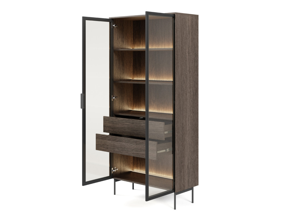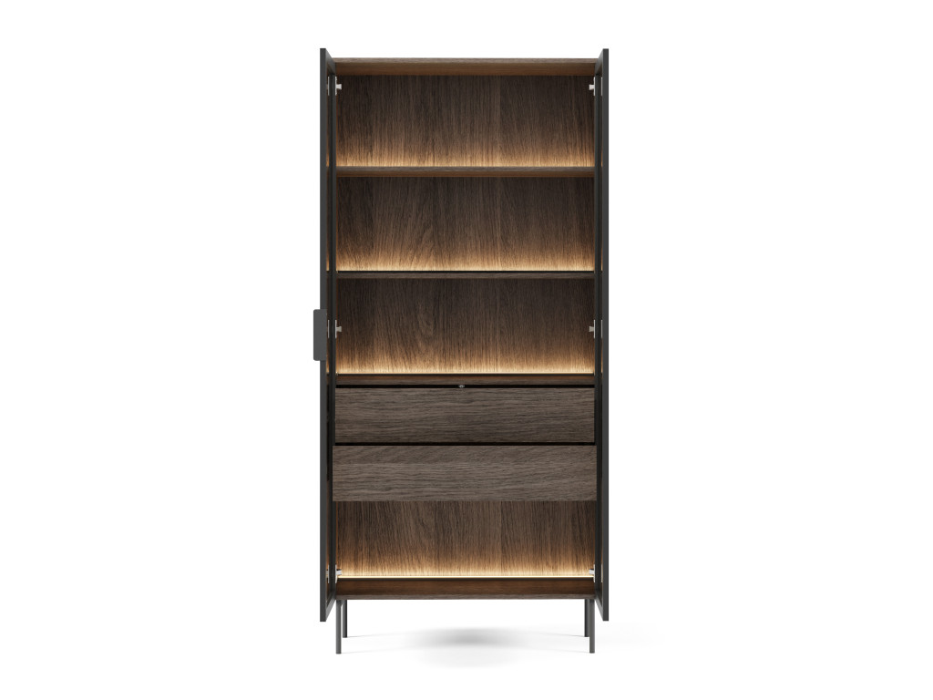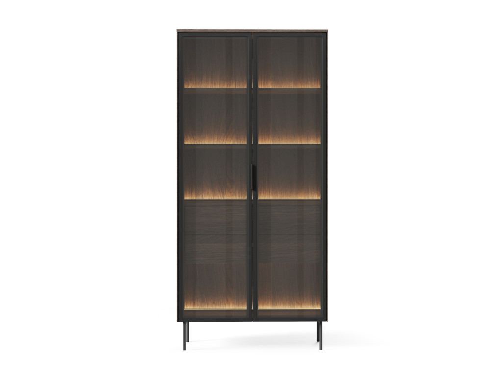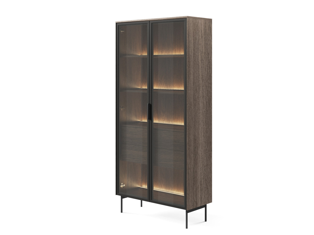 Vysoká vitrína Lumus A kombinuje prírodný dekor dub dunin s čiernymi prvkami a hnedým antisolovým sklom pre výnimočne štýlový vzhľad. Predná časť je z tvrdeného skla v čiernom MDF ráme a obsahuje teplé LED osvetlenie, ktoré vytvára príjemnú atmosféru. Kovové nohy a úchytky podčiarkujú moderný dizajn. Ideálne riešenie na vystavenie dekorácií v elegantnej obývačke.