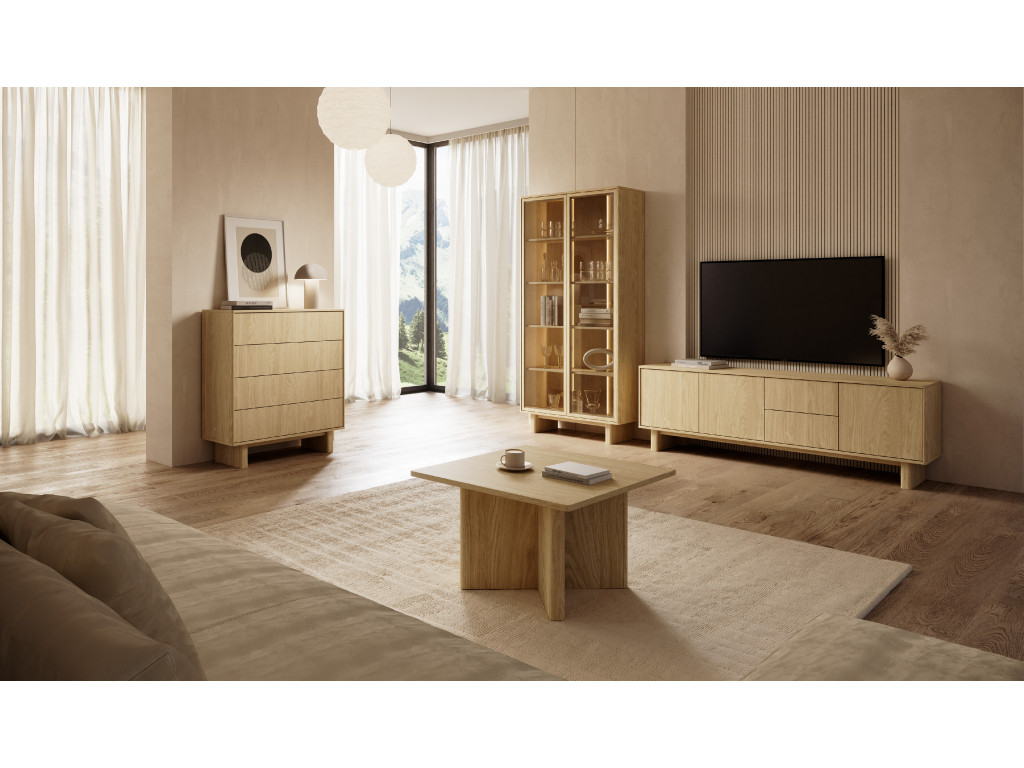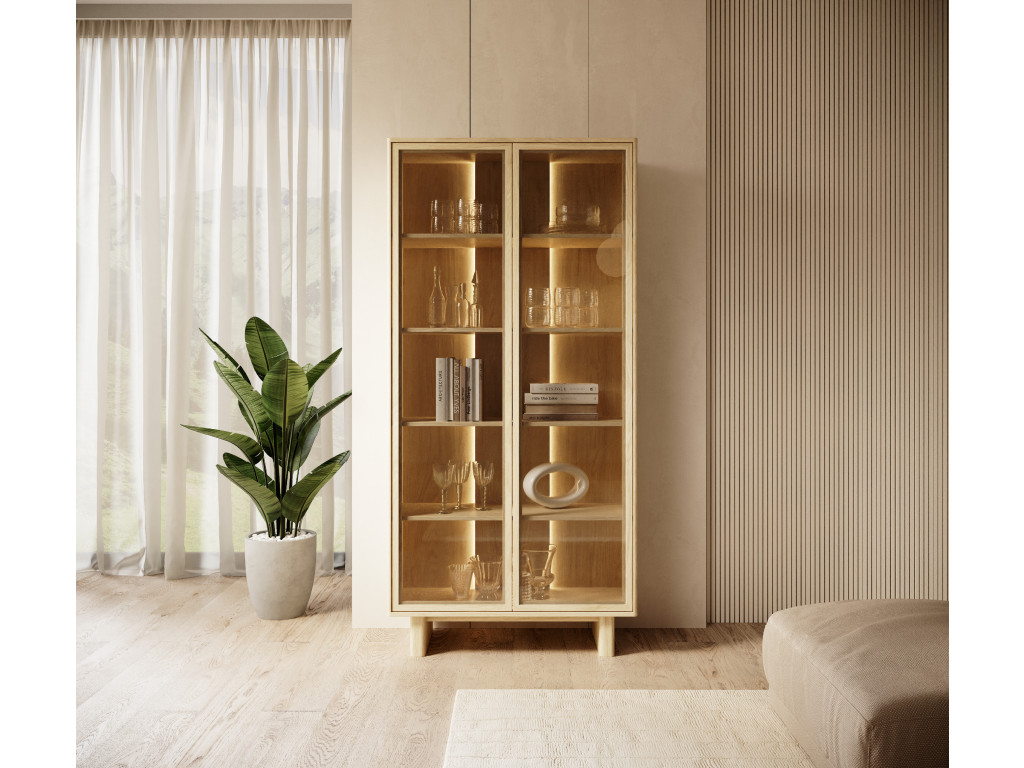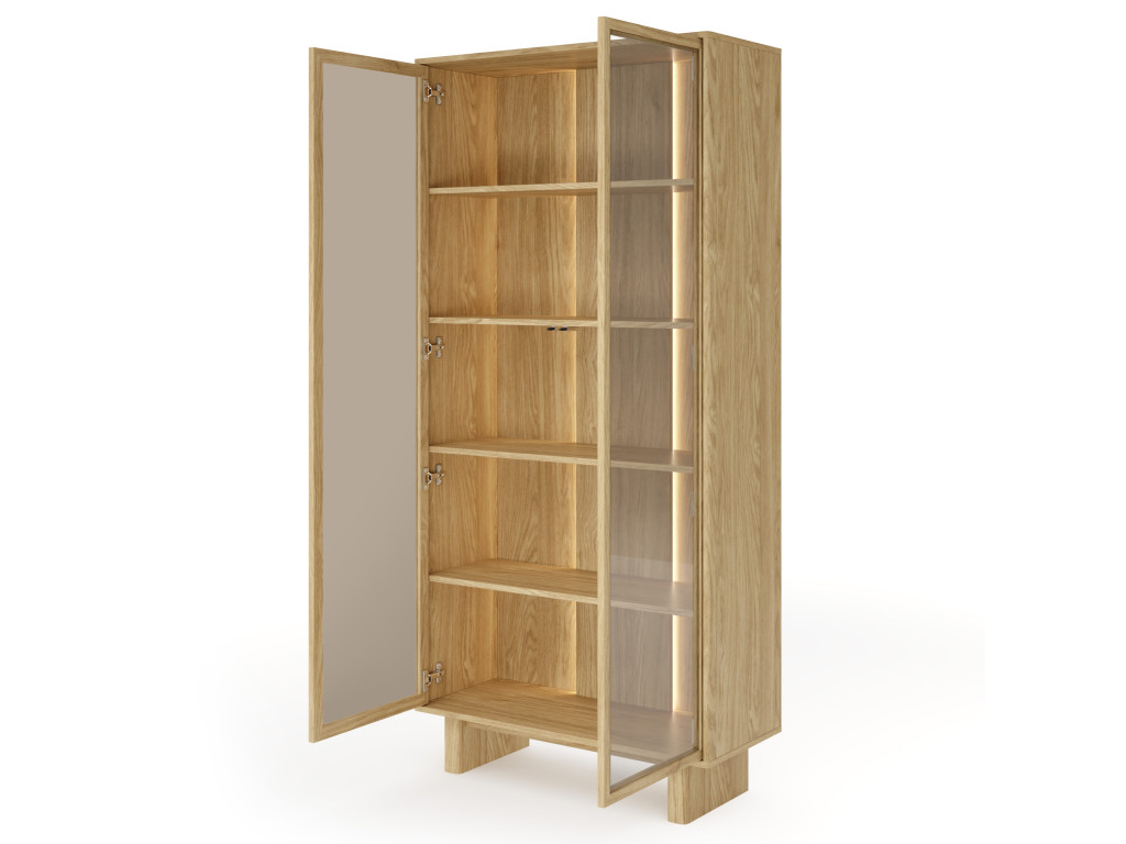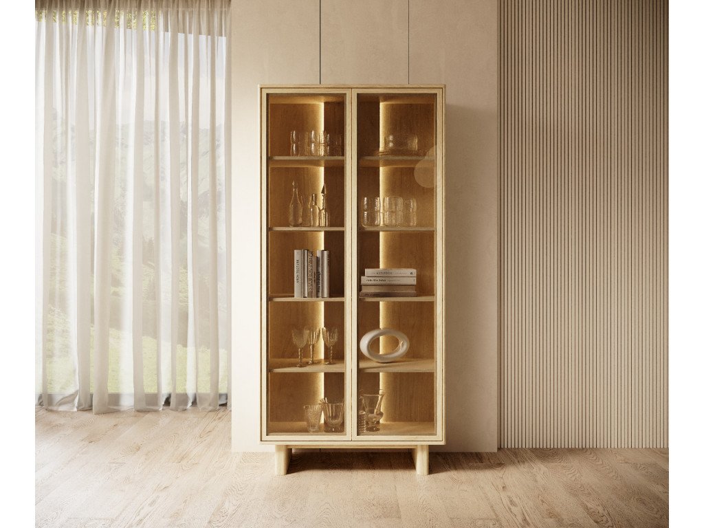 Vitrína je vybavená dvomi presklenými dvierkami a štyrmi policami, ktoré poskytujú priestor na vystavenie aj uskladnenie predmetov. Vyhotovená je v dekore dub olejovaný s dôrazom na zaoblené detaily a moderný vzhľad. Otváranie je riešené pomocou push-to-open systému bez úchytiek. Súčasťou je aj LED osvetlenie.