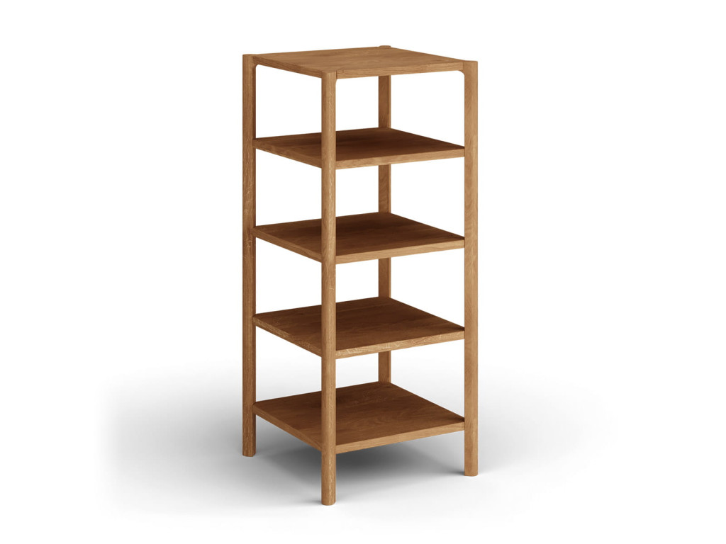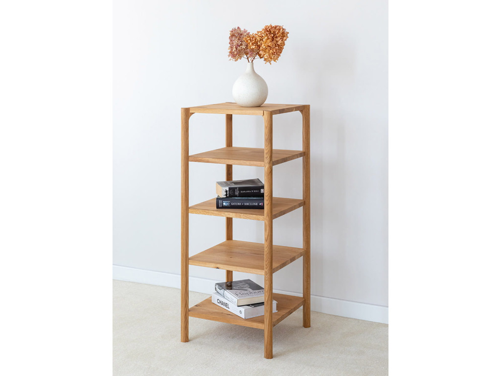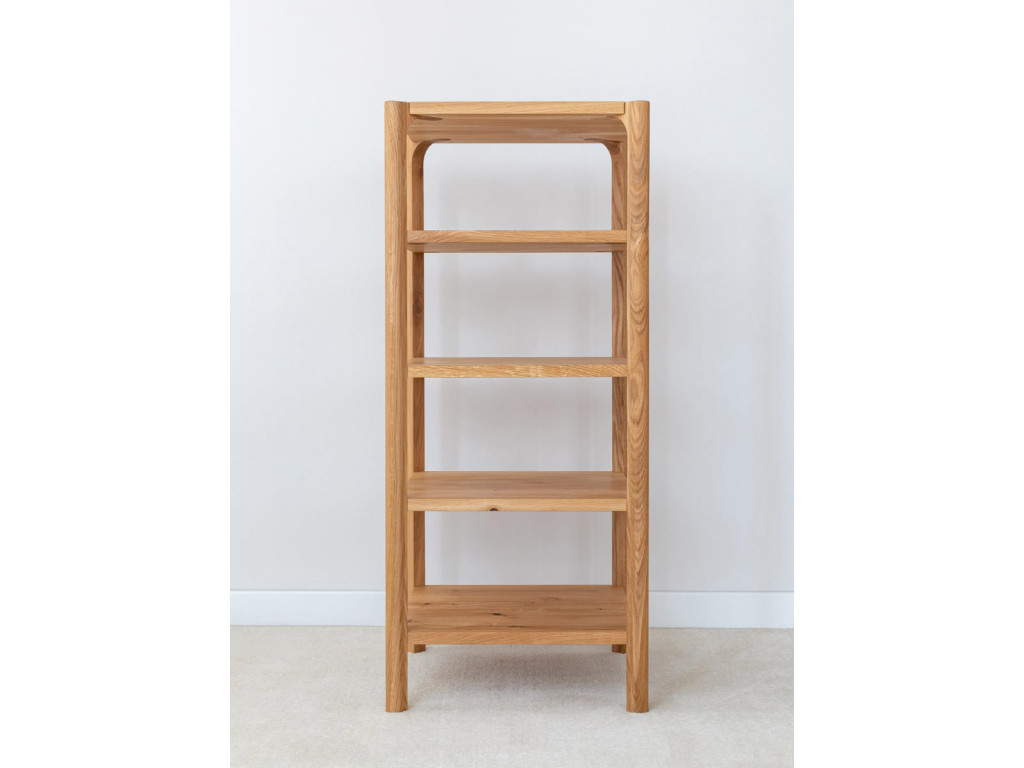 Úzky regál z kolekcie Campi z masívneho dubového dreva je navrhnutý s dôrazom na efektívne využitie vertikálneho priestoru a čistý minimalistický vzhľad. Povrchová úprava olejovaním v polomatnom prevedení zvýrazňuje prirodzenú kresbu dreva a zároveň ho chráni. Regál ponúka 4 otvorené police, ktoré poskytujú praktický priestor na knihy, dekorácie či drobnosti. Vďaka kompaktným rozmerom je ideálny aj do menších miestností alebo úzkych výklenkov. Rozmery: 43 × 100 × 43 cm (š × v × h).