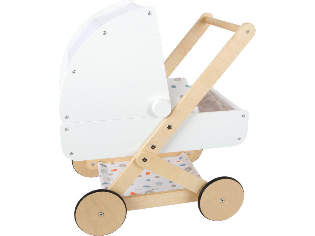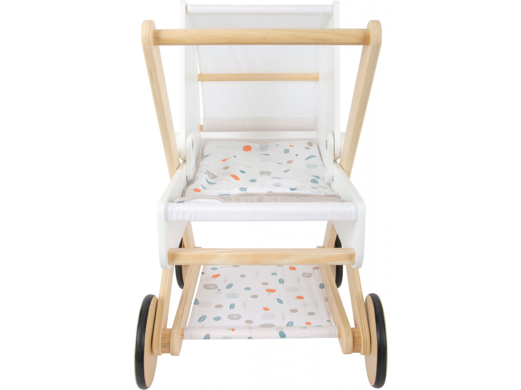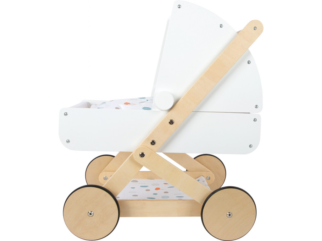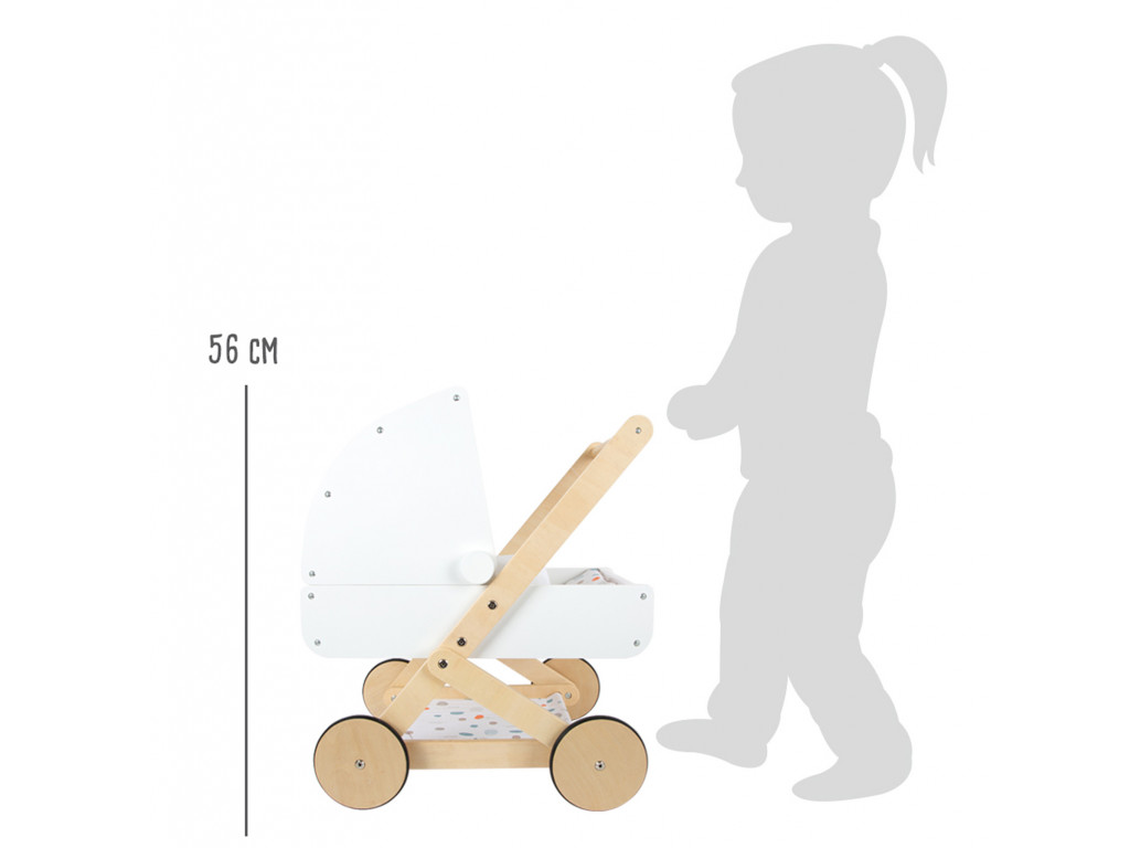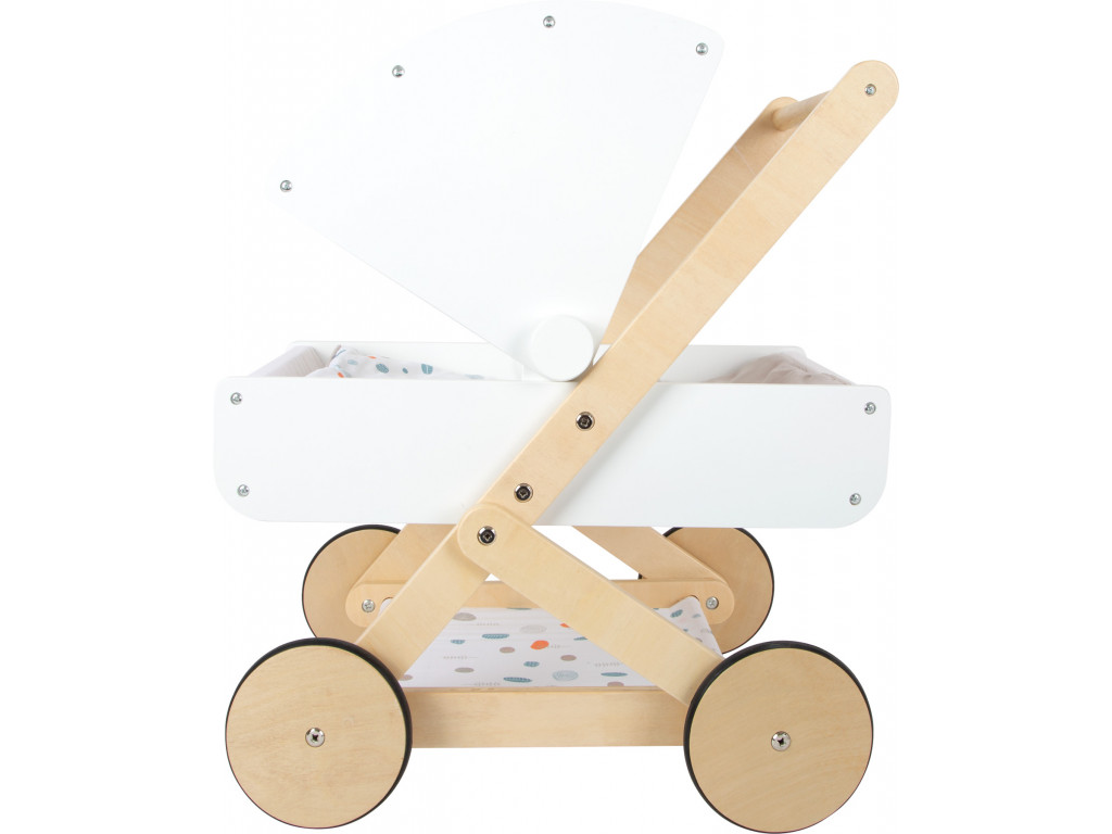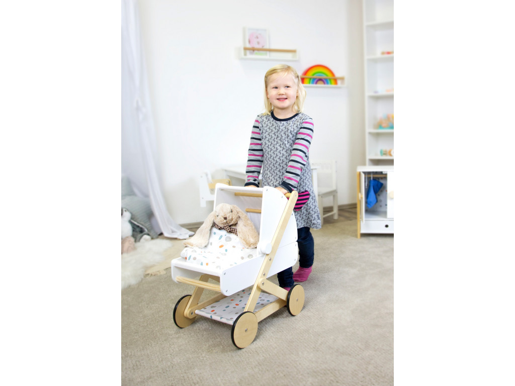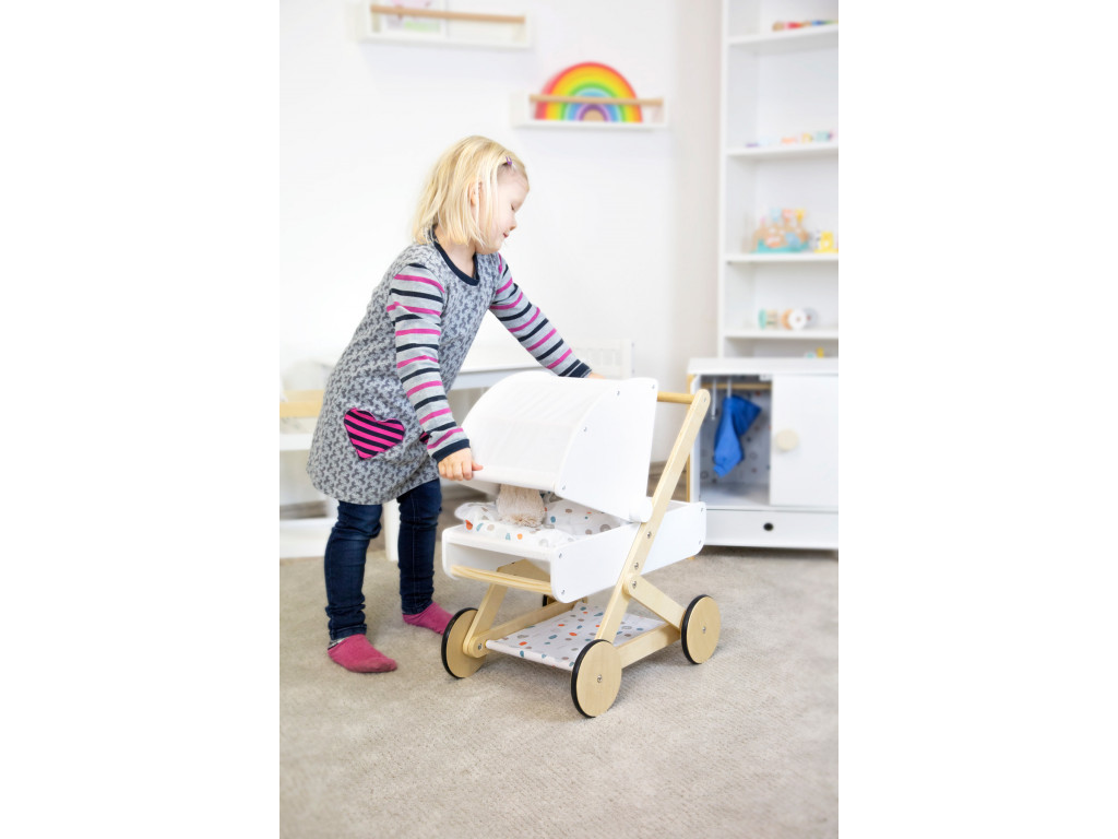 Pre bábiky, plyšáky a ich kamarátov len to najlepšie! Tento moderný kočík pre bábiky na vás urobí dojem svojím jemným, lineárnym škandinávskym dizajnom a tiež úložným priestorom pod lehátkom. Vďaka odklápacej strieške môžu bábiky a plyšové hračky z kočíka pozerať dopredu alebo dozadu. Obojstranné a farebne neutrálne obliečky s perinou nadmernej veľkosti zabezpečí, že bábiky a plyšové hračky do 46 cm budú v pohodlí. Kočík má tiché pogumované kolieska. Moderný kočík s prvkami z prírodného dreva, s umývateľným textilom len čaká kto sa v ňom zvezie! Je veľmi stabilný aj pri svojej nízkej váhe, hodí sa do každej izby a to vďaka svojmu neutrálnemu dizajnu.