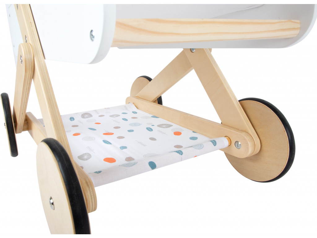 Drevený kočiarik pre bábiky poteší každú malú starostlivú mamu. Kočiarik v škandinávskom dizajne bude skvelým dopravným prostriedkom pre každú bábiku či medvedíka a zároveň aj vhodným doplnkom detskej izby. Kolieska sú pogumované, takže ani na tvrdých podlahách nenarobí veľa hluku.