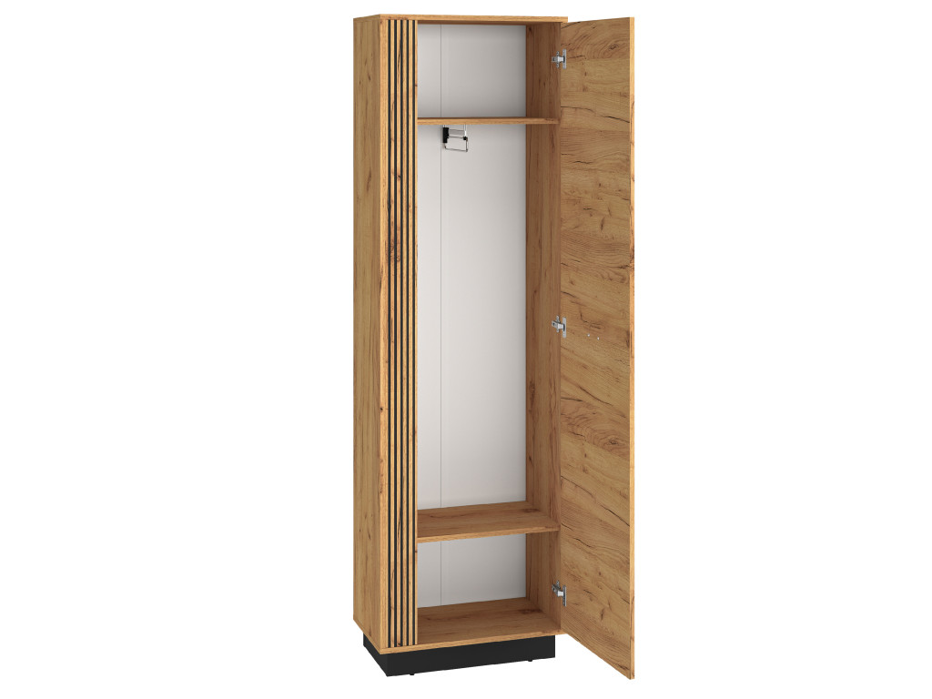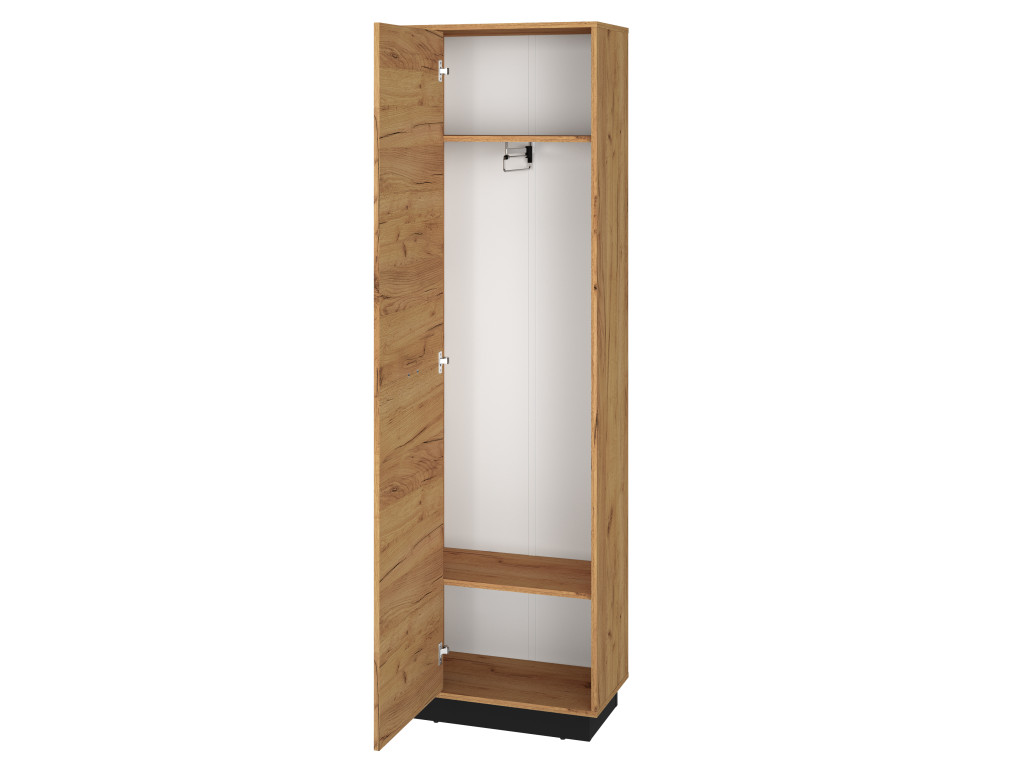Jednodverová skriňa Vasco 01 ponúka výsuvný vešiak, dve police a možnosť montáže dverí na ľavú alebo pravú stranu. Kombinácia prírodného dekoru a čiernych detailov vytvára moderný a funkčný kúsok pre každú predsieň.