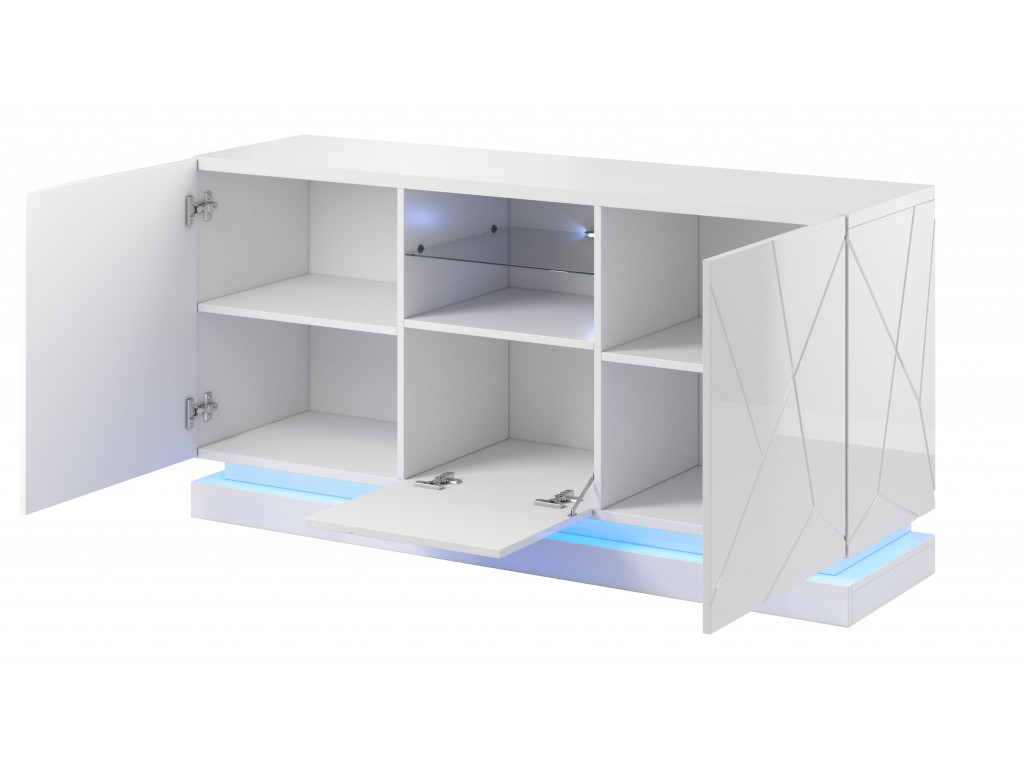 Po stranách sa nachádzajú 2 dvierka, ktoré ukrývajú jednu policu. V spodnej časti sú 1 vyklápacie dvierka a nad nimi sa nachádza úložný priestor s 1 sklenou policou. Modré LED osvetlenie je voliteľné a predáva sa samostatne.