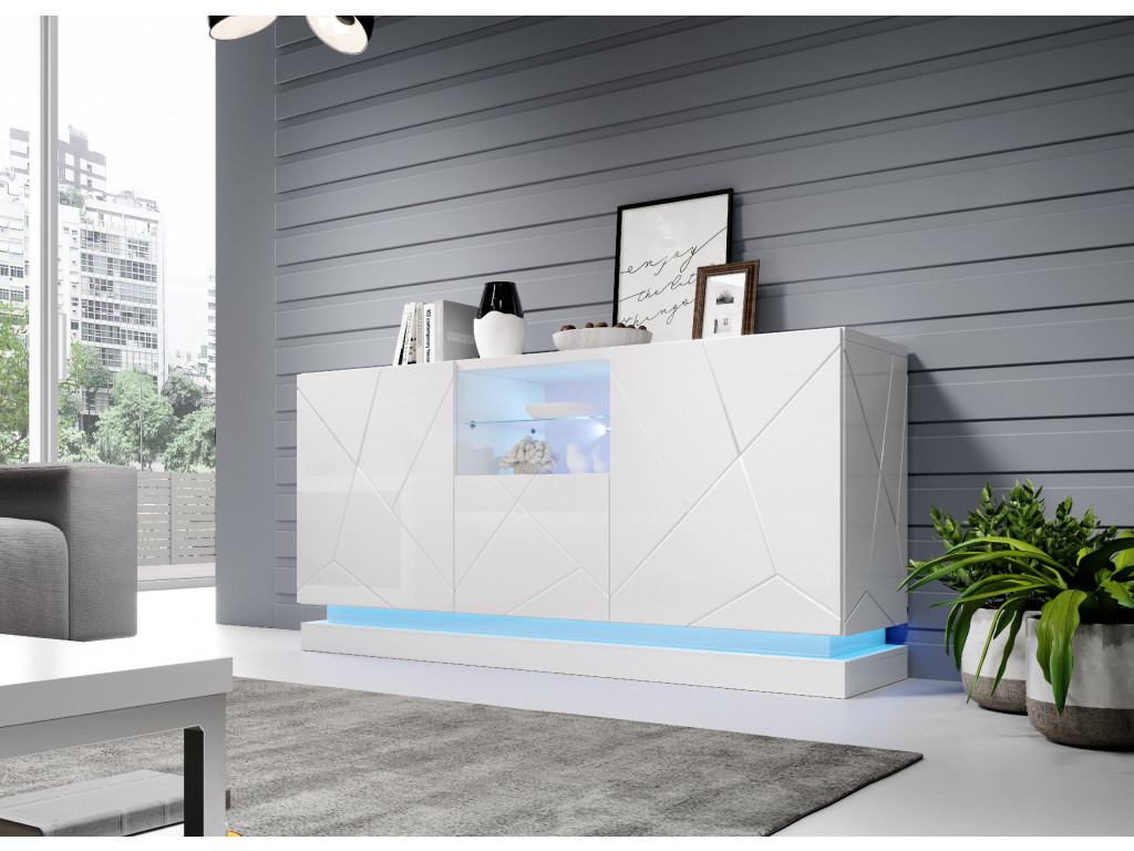 Elegantná biela komoda Qiu 2D1K je výrazným doplnkom do obývačky, spálne, predsiene či jedálne. Čelá a boky tejto komody sú dekorované ozdobným frézovaním. Samotný korpus stojí na vyvýšenom podstavci, ktorý je možné podsvietiť modrým LED osvetlením.