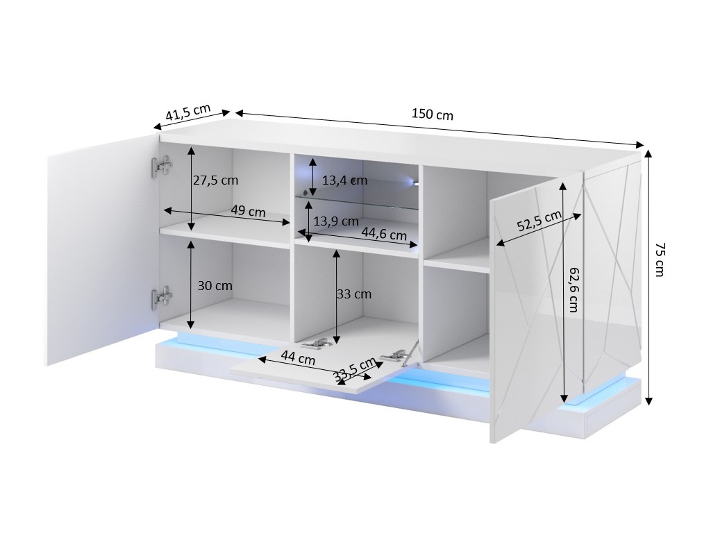 Po stranách sa nachádzajú 2 dvierka, ktoré ukrývajú jednu policu. V spodnej časti sú 1 vyklápacie dvierka a nad nimi sa nachádza úložný priestor s 1 sklenou policou. Modré LED osvetlenie je voliteľné a predáva sa samostatne.