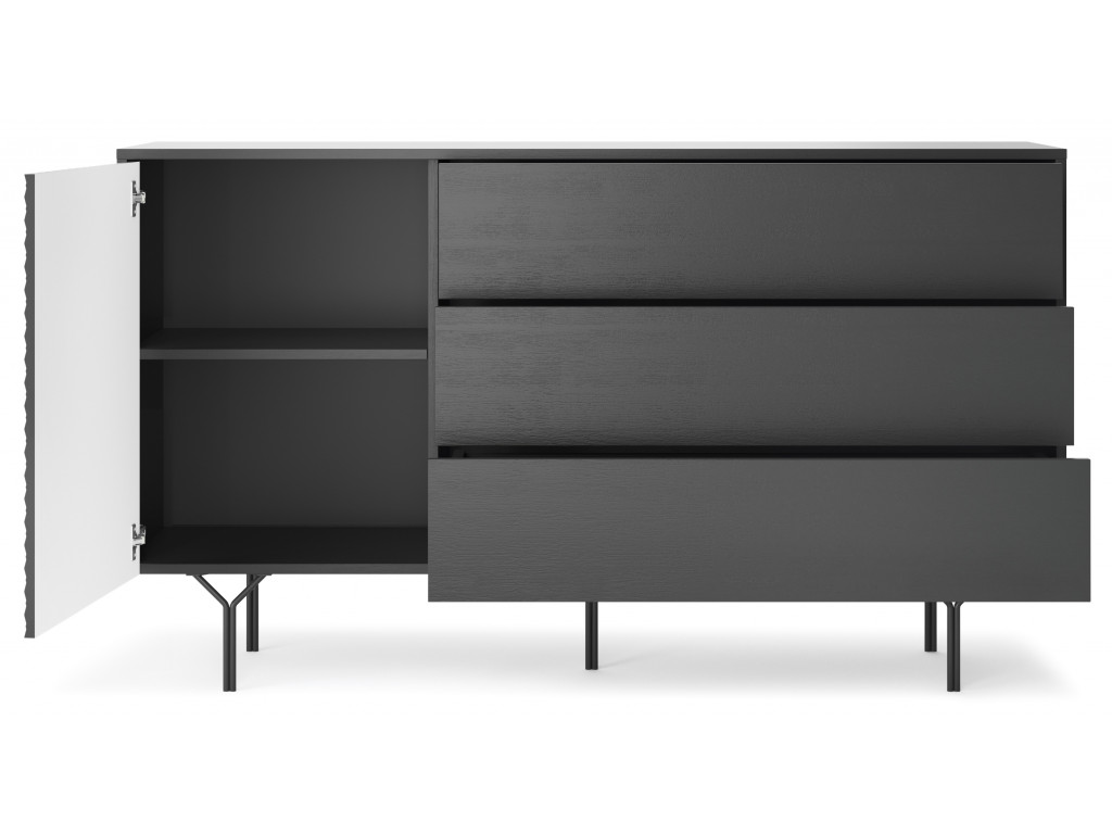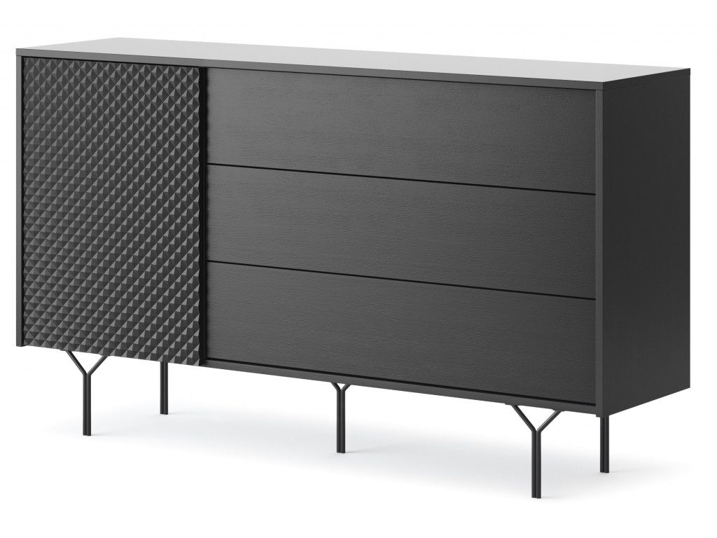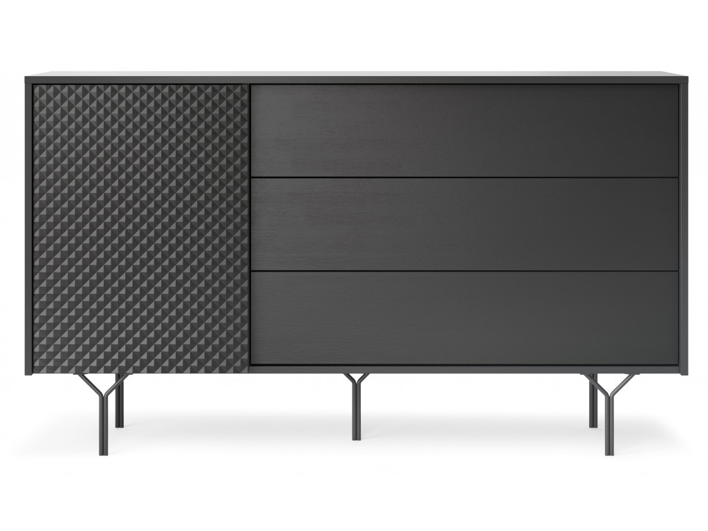 Priestranná komoda Raven v čiernom matnom prevedení vnesie do obývačky, chodby či jedálne elegantný a nadčasový dizajn. Komoda vyniká moderným dizajnom vďaka frézovaným dvierkam. Eleganciu podčiarkujú čierne oceľové nožičky na ktorých stojí. Komoda je vyrobená z kvalitnej drevotrieskovej dosky ukončenej ABS hranami. Predná strana je vyrobená z MDF dosky.